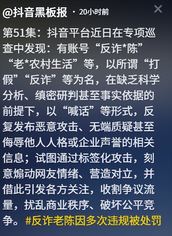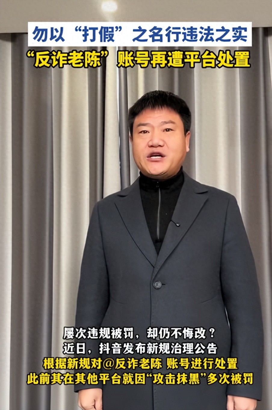 账号被封,老陈公开硬钢在2月28日,抖音官方发出声明,表示反诈老陈账号以打假知名,在缺乏事实依据科学分析的前提下,反复恶意攻击,无端质疑甚至侮辱他人人格和企业声誉。