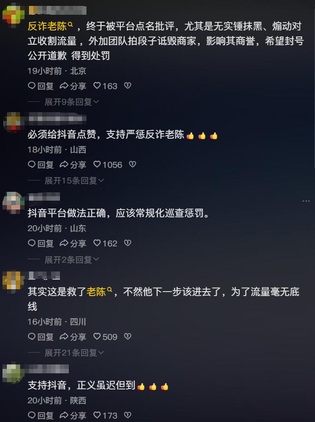 在封禁后,不少网友都拍手叫好,为平台做法点赞,支持对老陈这种为了流量不择手段的人予以封禁。