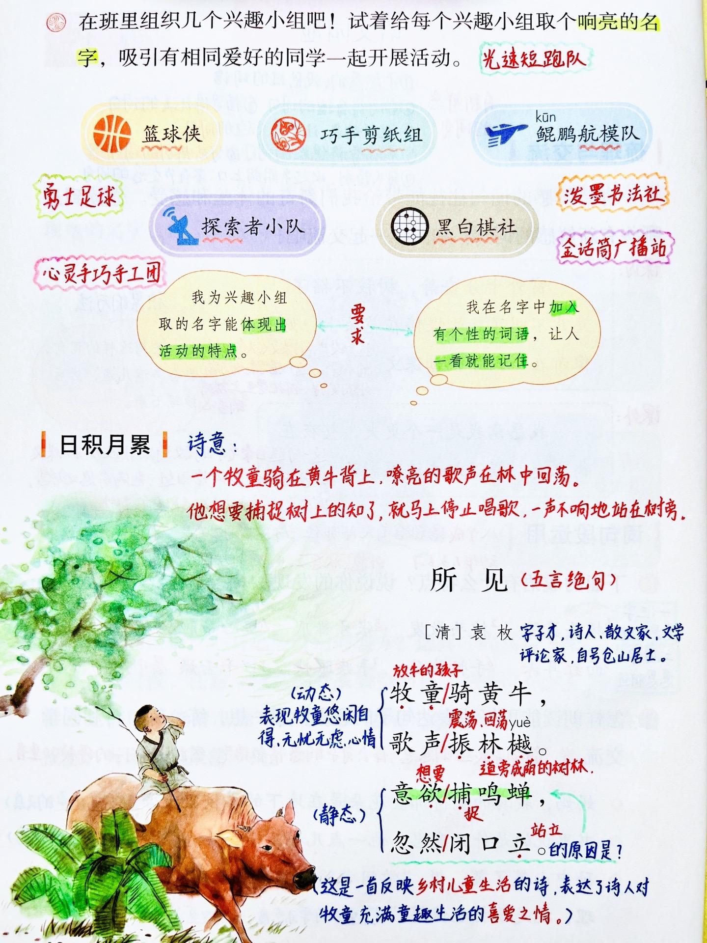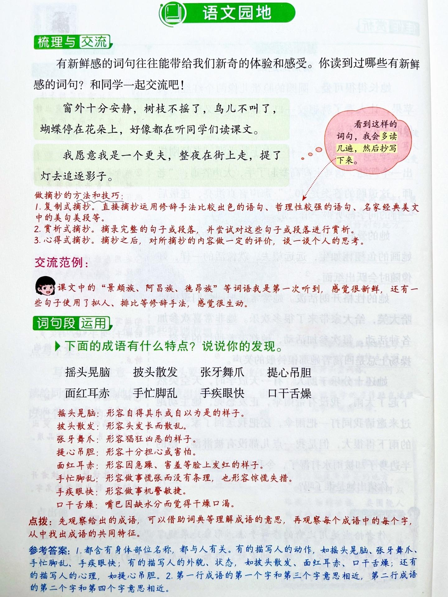 三年级语文上册《语文园地一》《口语交际》笔记。字词句运用中的八个成语解释在图4。 第一单元重点是积累新鲜感的词句。同学们可以在阅读课外书的时候,把新鲜感的词句多读一读,也可以摘抄下来。