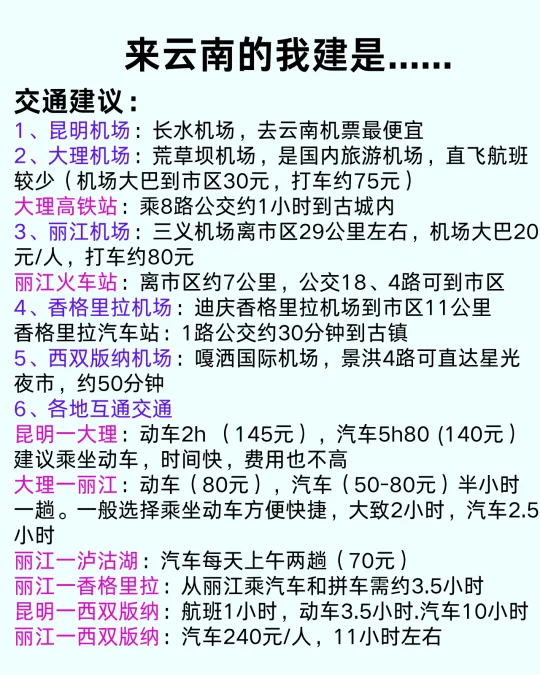 🔹 丽江机场:三义机场离市区29公里左右,机场大巴20元/人,打车约80元;丽江火车站:离市区约7公里,公交18/4路可到市区