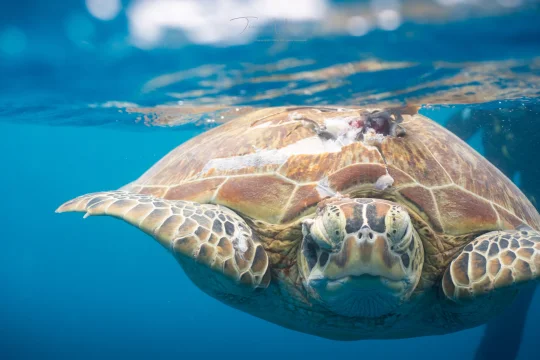 不料在我们最后一天返回水面时,遇见了令人揪心的一幕:一只年轻的绿海龟漂浮在水面上,背甲上裂着深深的创口,明显是被螺旋桨打伤的。血污已经散去,白色的骨肉触目惊心,它奄奄一息,偶尔动弹一下鳍肢,还想向前游去,却到底不能。这只海龟沉默地承受着,它的眼睛似古旧的玻璃珠,茫然、痛苦,在海浪中很无助。