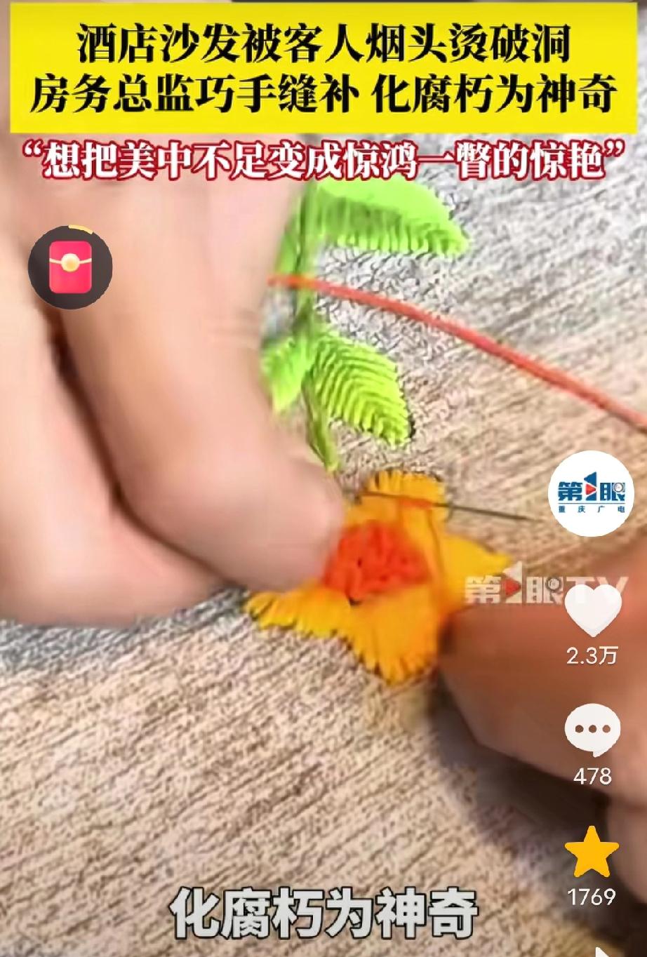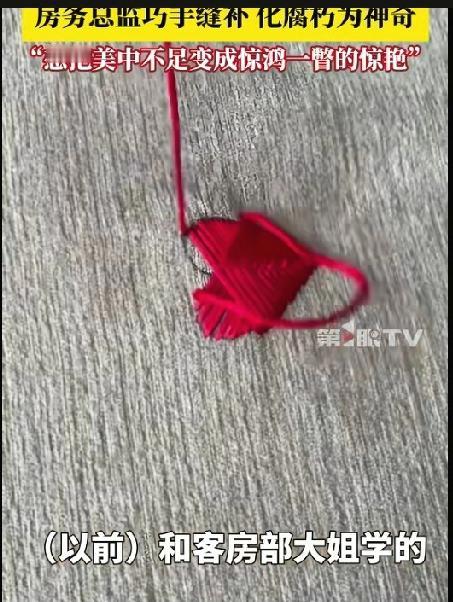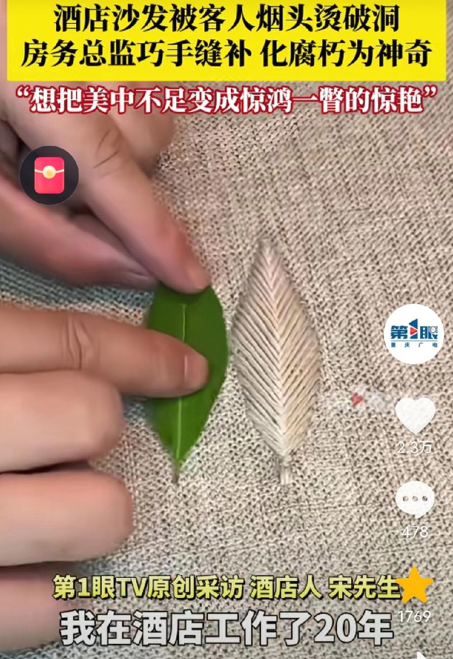 “人怎么可以这么聪明!”酒店沙发被客人烫出个洞,客房总监看到很是心疼,于是就想出了一个办法,用针线在上面缝出叶子形状…还别说,缝完后真的很惊艳,很多客人看见还发圈晒呢! 据媒体9月16日报道,四川巴中,一酒店客房总监发现,沙发地毯上被客人的烟头烫的小洞,他就向客房大姐讨教了一套缝制技术,根据不同小洞缝制不同的图案,如树叶,红心,小花,白鹤等,看上去栩栩如生如真的一样,有细心的客人发现后还拍视频发圈晒图。 不得不说,这样将小洞补好后,沙发被烫的小黑洞,立刻成了吸睛的亮点,这样的巧思真的挺好。 酒店有这样的客房总监真的是有福了,这确实是干一行爱一行呀! 对此有网友表示,同样是打工,这样的让人喜欢,有些人气死人还天天嫌工资低。 也有网友说,本来是个碍眼的破洞,缝完直接成了沙发上的小亮点,这样还能说什么呢,怪不得人家是总监! 为这位心灵手巧的房务总监点赞! 本来不完美的沙发,经过他的手竟变成了“限量款”,这比买一个新沙发可值钱多了。 其实,生活中我们不缺新东西,而是发现美的眼睛和一双巧手,如果我们愿意去改变,瑕疵也会成为惊艳!