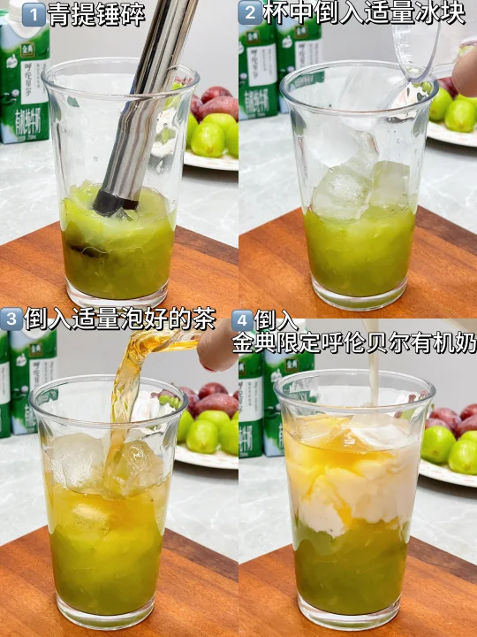 做法超简单!把青提锤碎,倒入冰块和泡好的茶,最后倒入牛奶就可以啦~