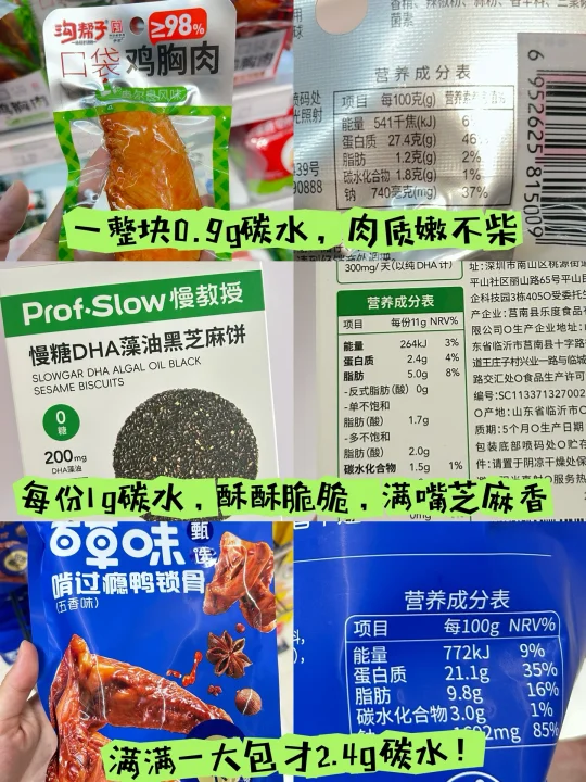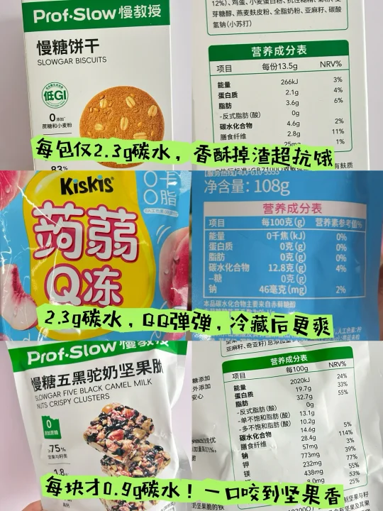 1. 慢教授0糖饼干:每份仅2.3g碳水,用料是高原黑青稞谷物配方,谷物香浓郁超好吃,挺抗饿的,下午加餐配茶绝了