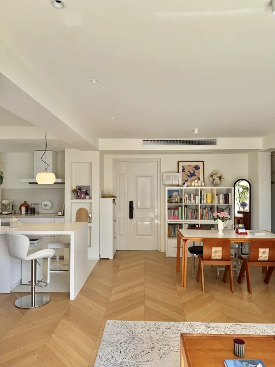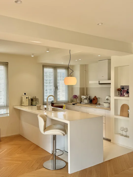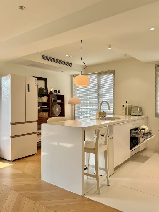 这篇主要分享厨房改造。原厨房不到5平,砸掉非承重墙,厨房和书房设计成一个共享的开放式空间。橱柜采用2排一字型布局,没有做吊柜,视觉上更清爽显大。岛台总长3m,吧台长1m,饭后打扫起来干净利落。