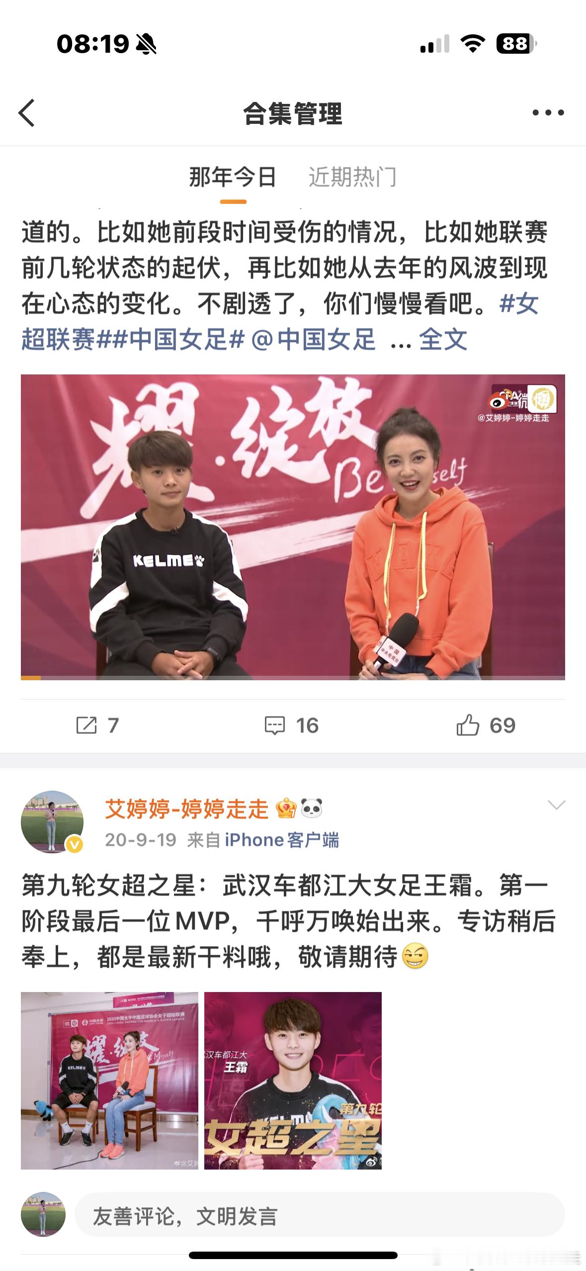 图1: 两年前的今天,我与王珊珊面对面,谈23年女足世界杯中国队无缘小组出线的困惑和老将的无奈;图2:五年前的今天,特殊时期赛会制的女超联赛第一阶段收官,我在海埂基地与那一轮的MVP王霜谈特殊时期的武汉女足和女超;图3:图3: 六年前的今天,出发去拍女超联赛收官,那一年的女超,江苏队提前两轮夺冠,大连队要与女甲打附加赛,一个时代的结束;图4:十年前的今天,清晨6点从渭南出发,转战郴州,中国女足的两场热身赛。前一天中国女足官宣了新任主教练法国人布鲁诺上任,我第一时间在渭南对他进行了专访。这些年的今天,我做了好多事啊[嘻嘻]艾婷婷婷婷走走[超话]中国女足足球