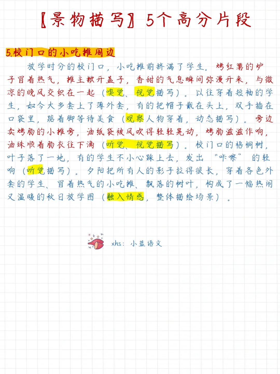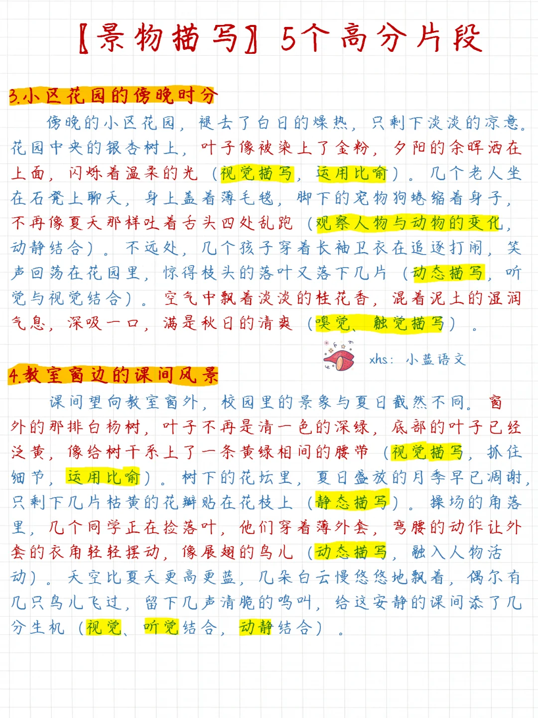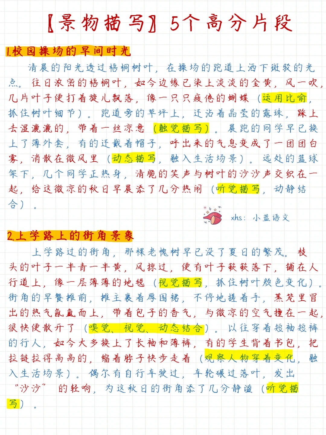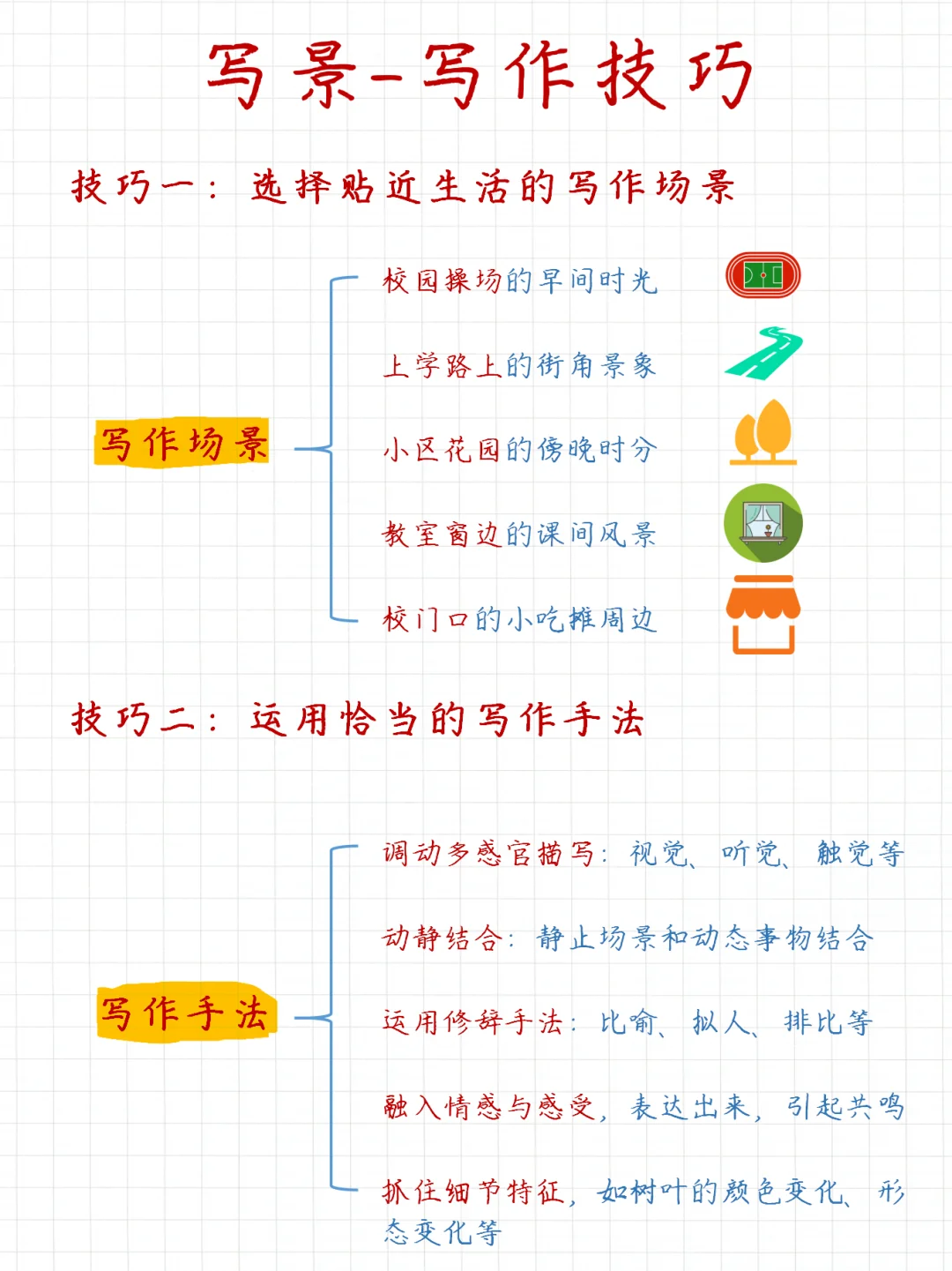 要注意选择贴近生活的写作场景,可以采用调动多感官描写、动静结合的手法,还有比喻、拟人、排比等修辞手法来增强语言的感染力,让景物更形象鲜活。我们还需要抓住细节特征,融入自己的情感与感受。