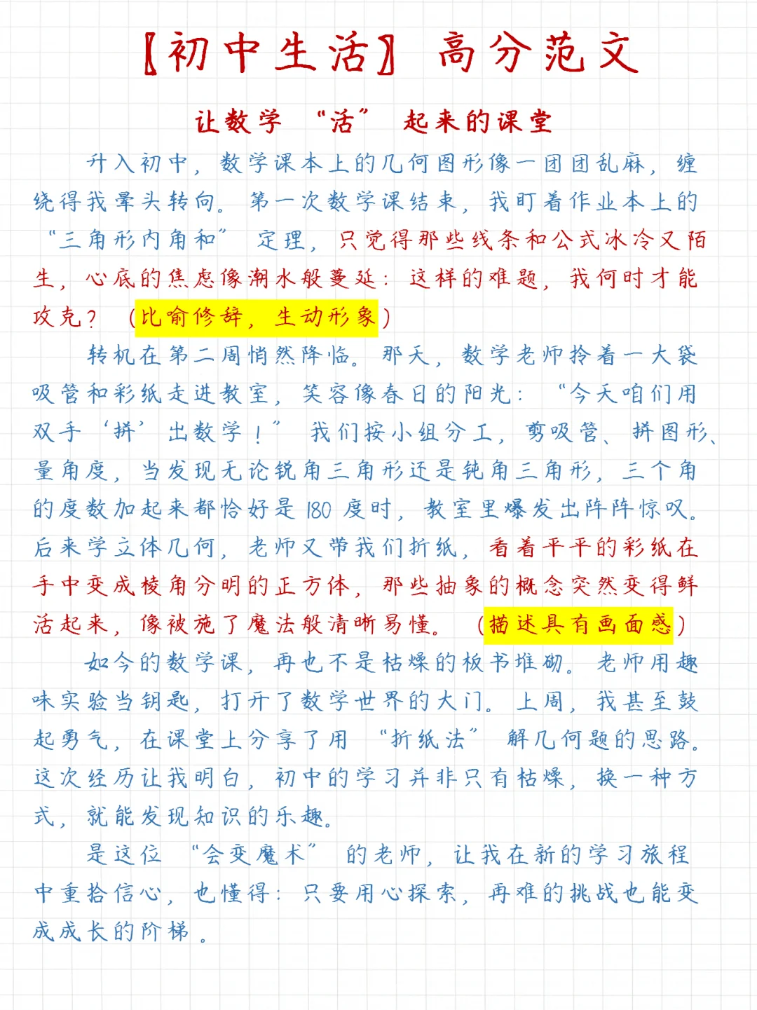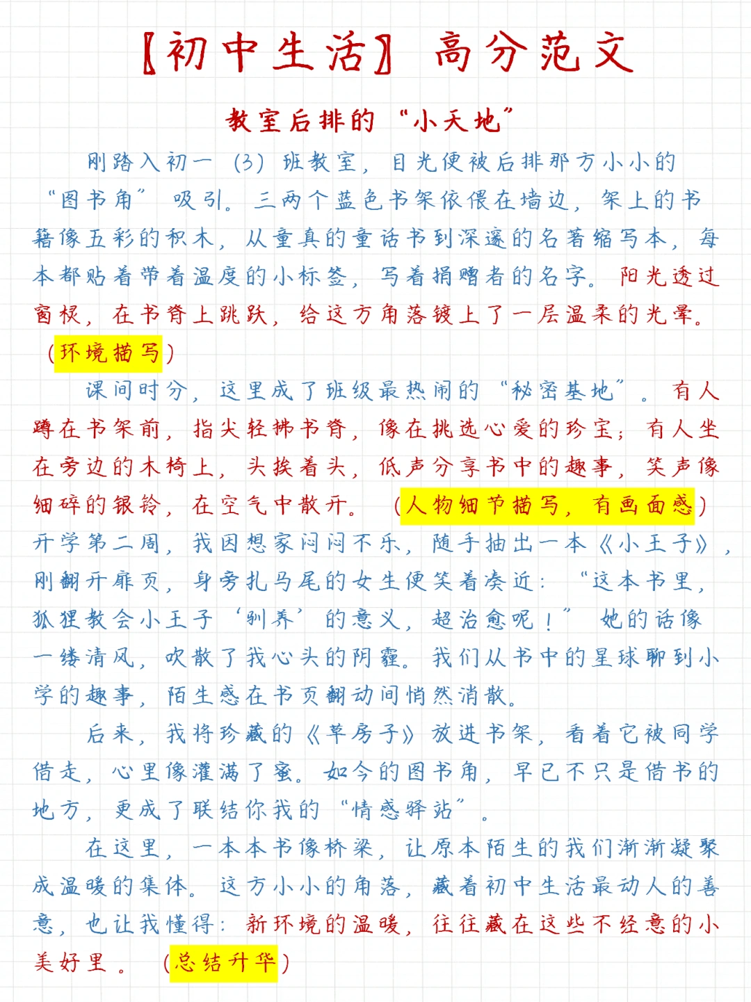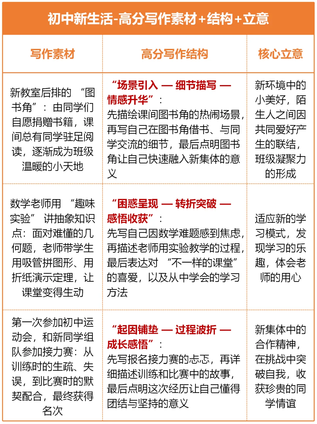 针对初中新生活,老师给大家总结了[五R]种高分写作素材和结构: