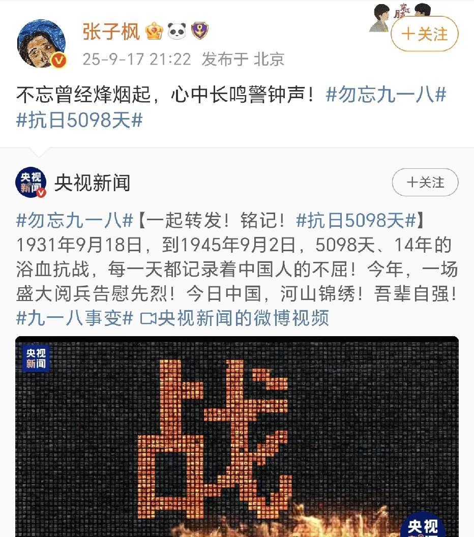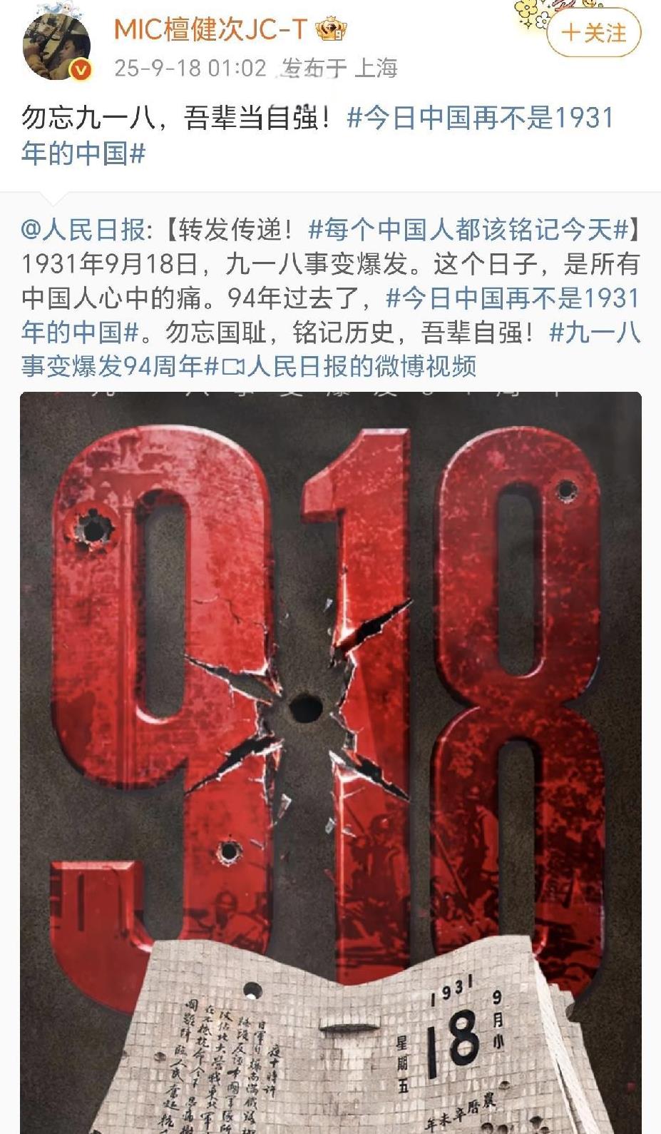 众星发文勿忘九一八! 9月18日,是特殊的日子,是九一八事变94周年的日子,作为中国人,我们要铭记历史,勿忘国耻。 关晓彤、檀健次、张子枫、张馨予等众星纷纷在社交平台转发人民日报、央视新闻等官方媒体纪念九一八的消息,铭记历史,缅怀先烈! 今日中国,再也不是1931年的中国,铭记历史,缅怀先烈,吾辈自强,吾辈奋进!勿忘九一八国耻!
