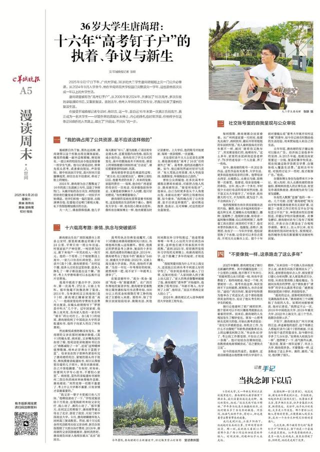 2025年9月17日下午,广州大学城,36岁的大二学生唐尚珺刚刚上完一门公共必修课。从2024年9月入学至今,他在华南师范大学校园已完整读完一学年,这也是他首次完成一年以上的大学生活。