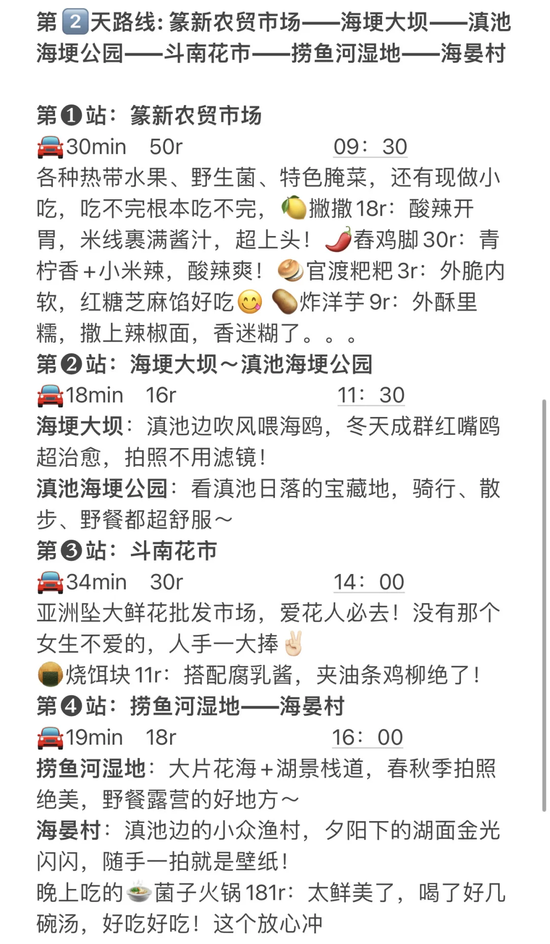 篆新农贸市场——海埂大坝——滇池海埂公园——斗南花市——捞鱼河湿地——海晏村
