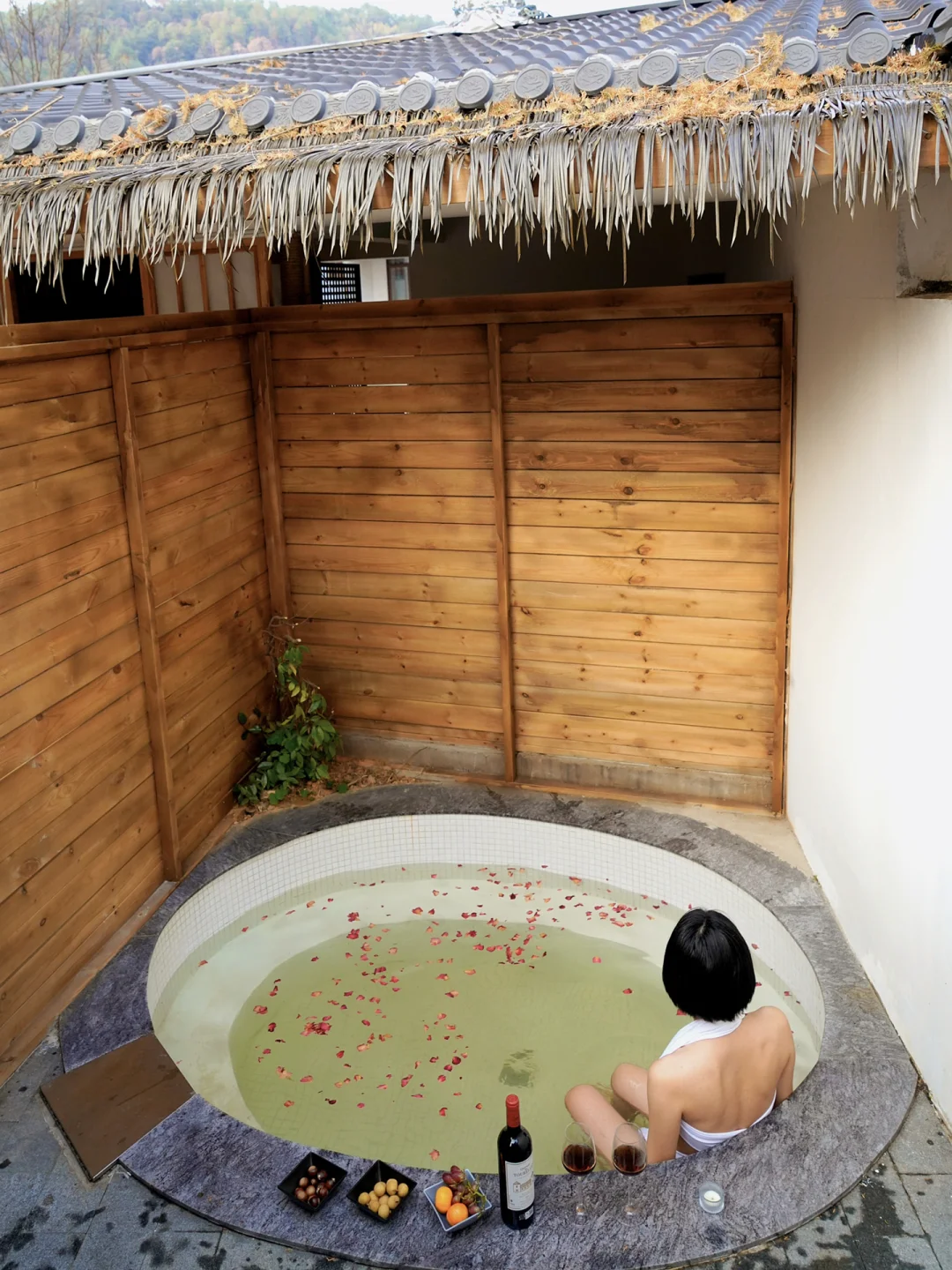在茶棚旁还有户外的私汤,适合情侣和亲子泡,可以提前让民宿准备牛奶浴玫瑰浴。