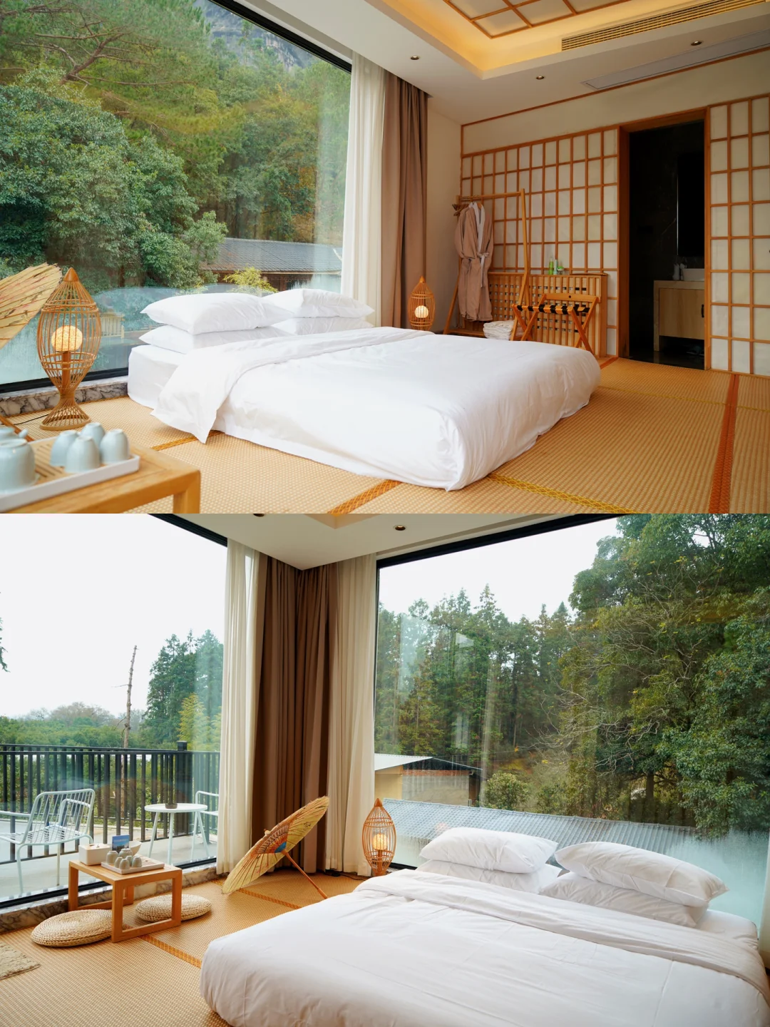 这家房型比较多拥有45间房,风格迥异各有不同,有面朝山林野趣的景观房和自带汤池的汤泉房,房间是大落地窗将林海风景尽收眼底,还有泡泡屋星空房复式家庭房,都很适合情侣或家庭出游,在泡泡屋晚上可以看星空是多浪漫的事。