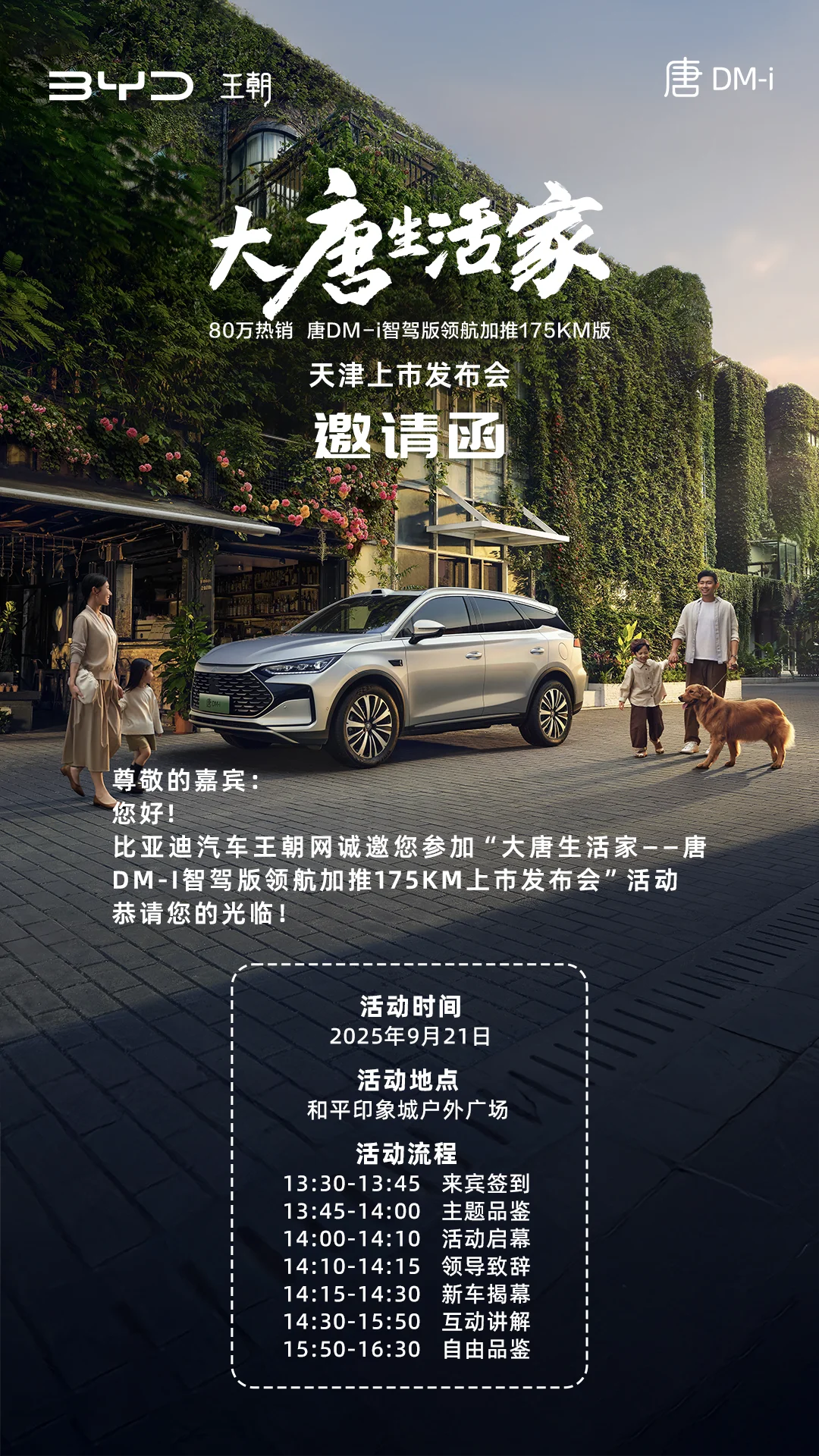 一台可以十年畅销、不断迭代的SUV,空间舒适,内饰高级,全家出行自在随心。 唐DM-i智驾版领航加推,拓展了大家庭的出行新方式,出行安心、省力、有趣,带娃也能从容不迫,和唐一起出发,奔赴春夏秋冬的风景。 唐DM-i智驾版领航加推175KM版,9月21日下午在天津和平印象城户外广场上市发布会,还🈶更长纯电续航、更贴心功能配置、更常用常新的智能体验,据说还有手冲咖啡DIY体验,明儿去看看~💃🏻🕺🏻
