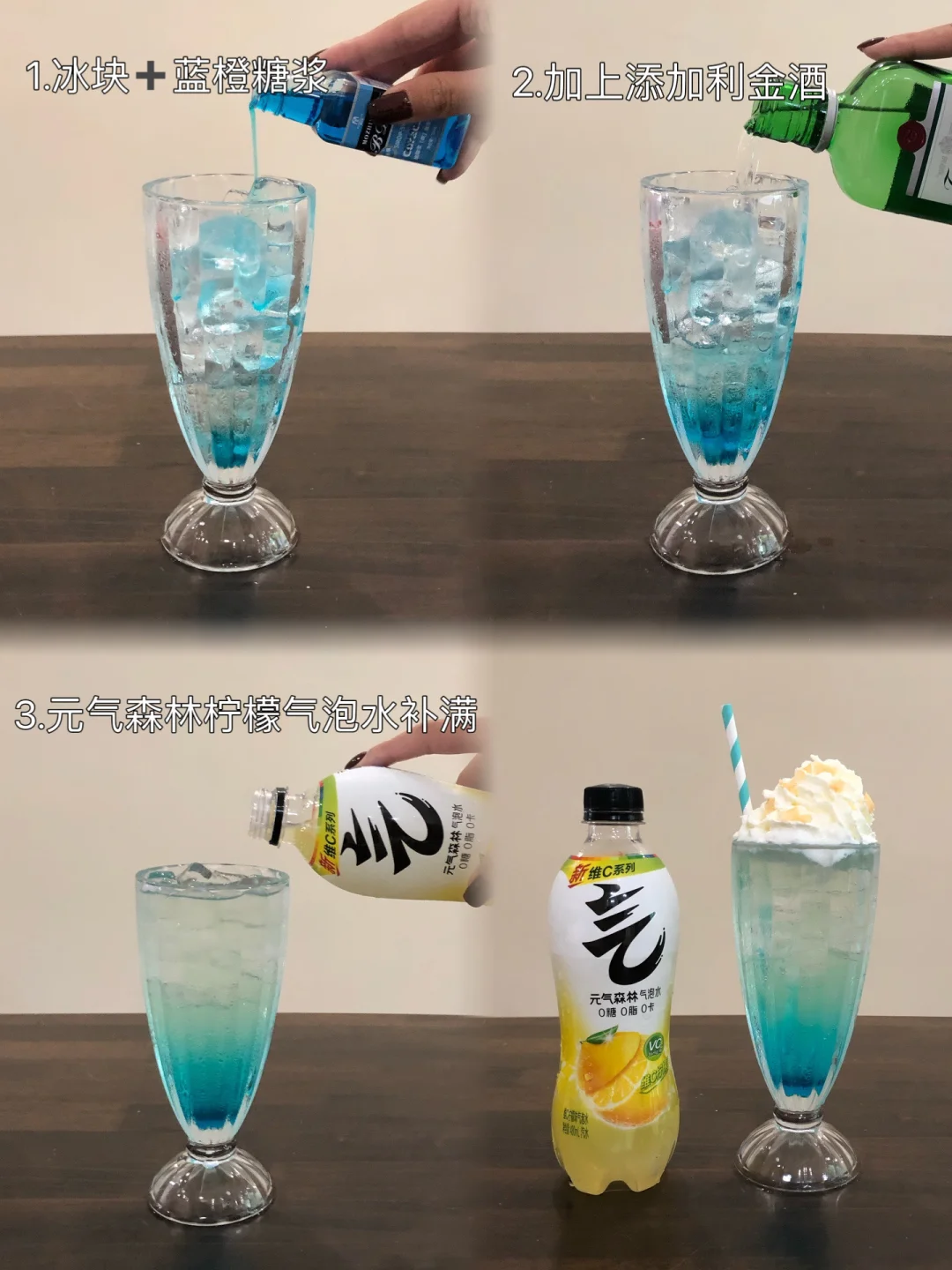 1.满杯冰块加上少许蓝橙糖浆调色 2.加上添加利金酒 3.元气森林柠檬气泡水补满 4.加上奶油顶和椰子脆片