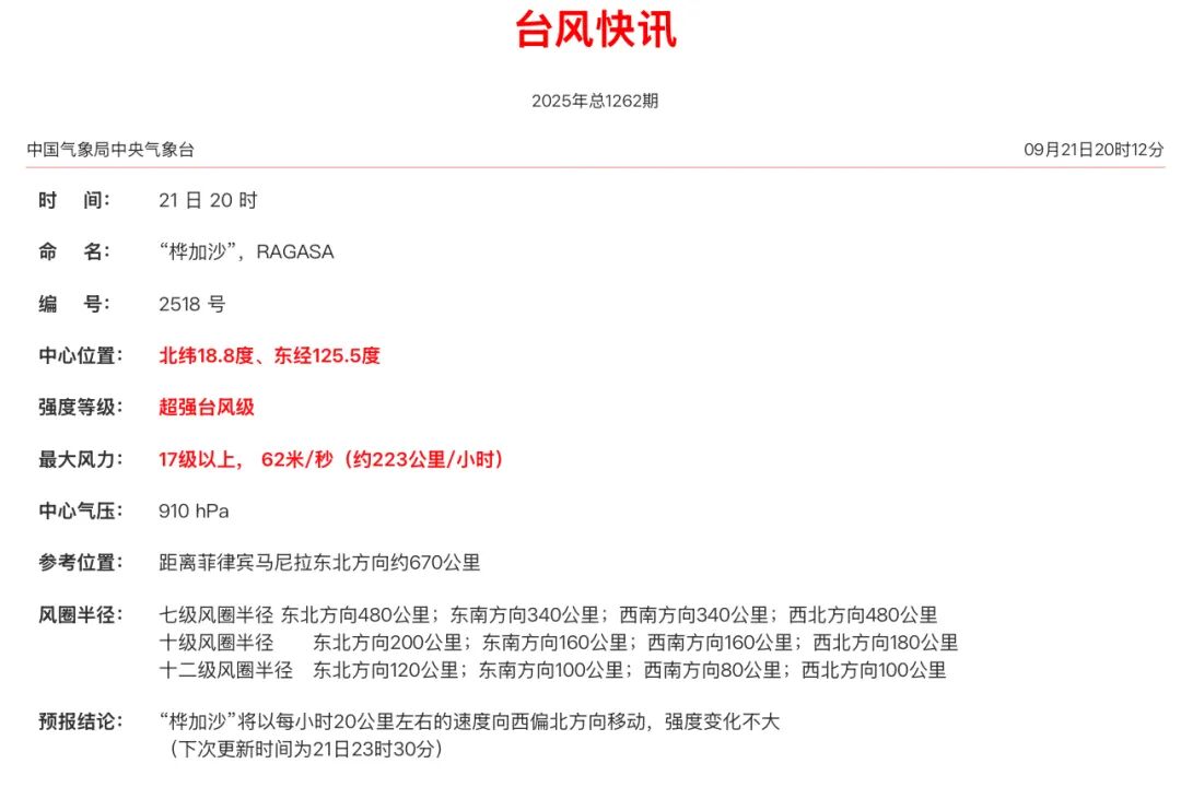 根据中央气象台9月21日20时12分发布的台风快讯,今年第18号台风“桦加沙”,中心附近最大风力达到62米/秒,已经达到17级以上。