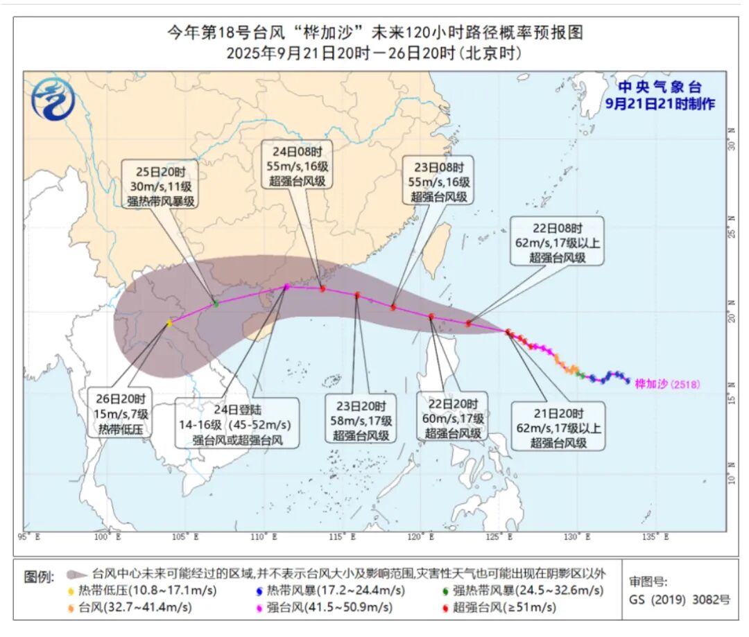 中央气象台21日21时发布的“桦加沙”路径和强度预报