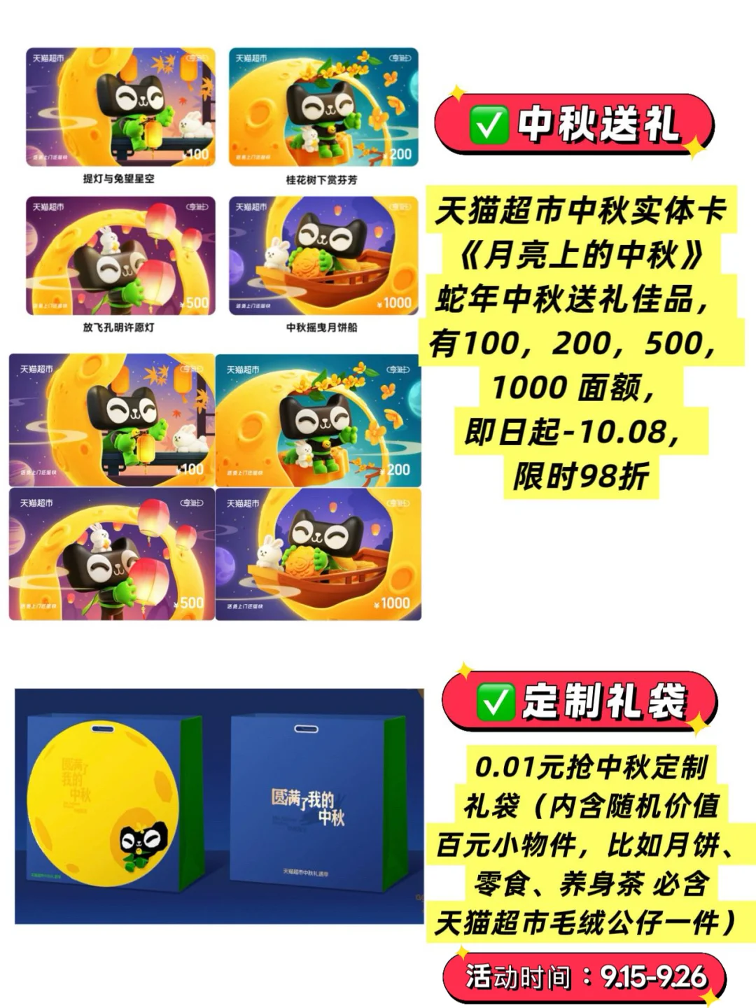 说到中秋露营🏕️,多亏了天猫超市半日达!前一天晚上我想着要准备些露营吃的用的,抱着试试的心态下单,结果第二天一早居然就送到了🎁,这速度真的太惊喜啦!像坚果礼盒、纯奶、养生茶,还有颜值超高的月饼🥮,尤其是三只小牛和美心月饼,带着去露营,和家人朋友分享特别合适~而且现在天猫超市中秋好礼,官方立减8.8折起,中秋实体卡有100-1000等不同面额,送人很拿得出手,对方也不太会拒绝~心意都能送的出去,10月8日之前买还限时98折呢,超划算!对了,9/15-9/26期间,打开手机淘宝搜“天猫超市”,0.01元就能抢中秋定制礼袋🎁,里面有随机价值百元小物件,还必含天猫超市毛绒公仔呢~要是想下单,打开淘宝直接进“天猫超市”半日达会场,或者从闪购点“超市便利”进入都可以,超方便~