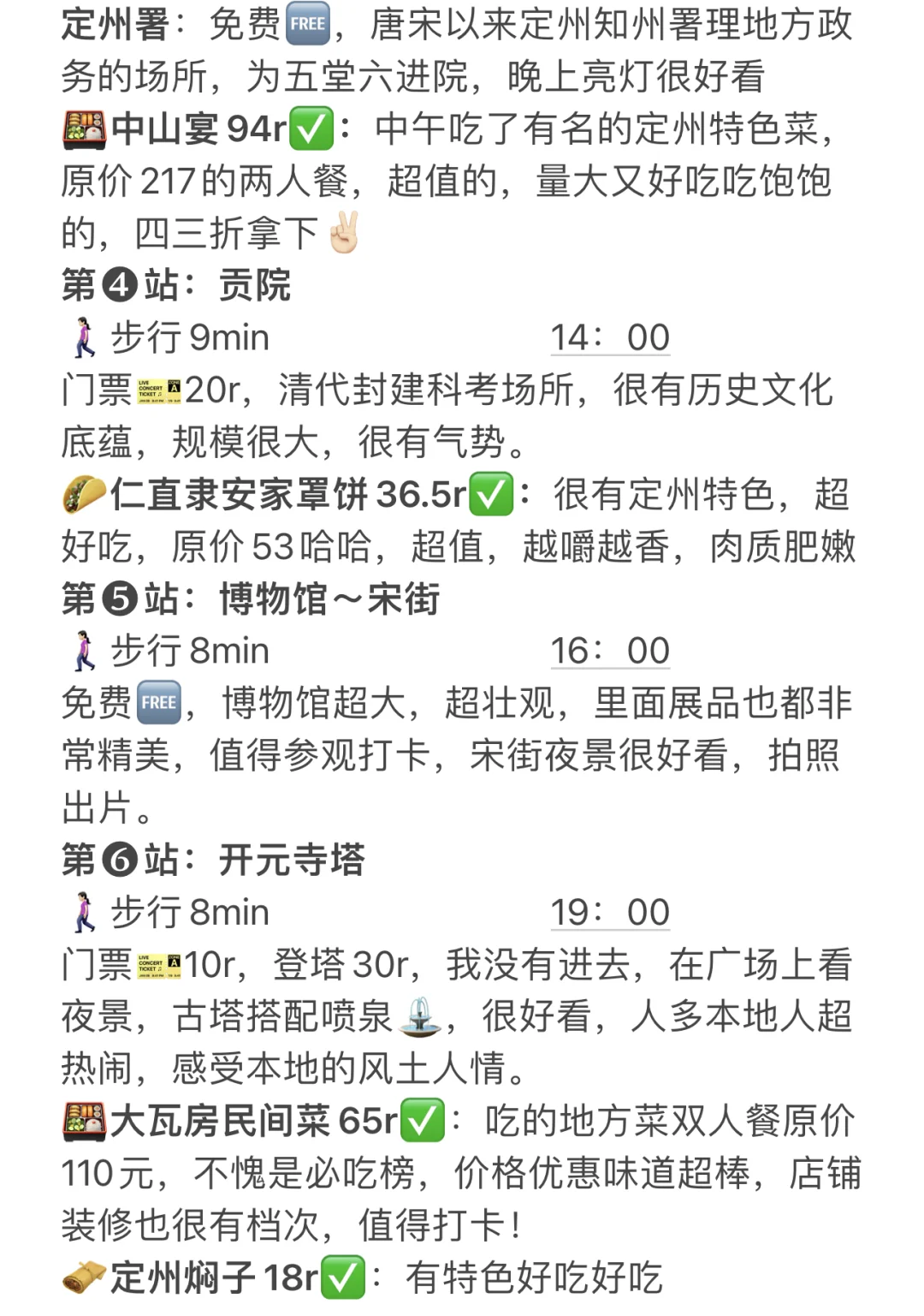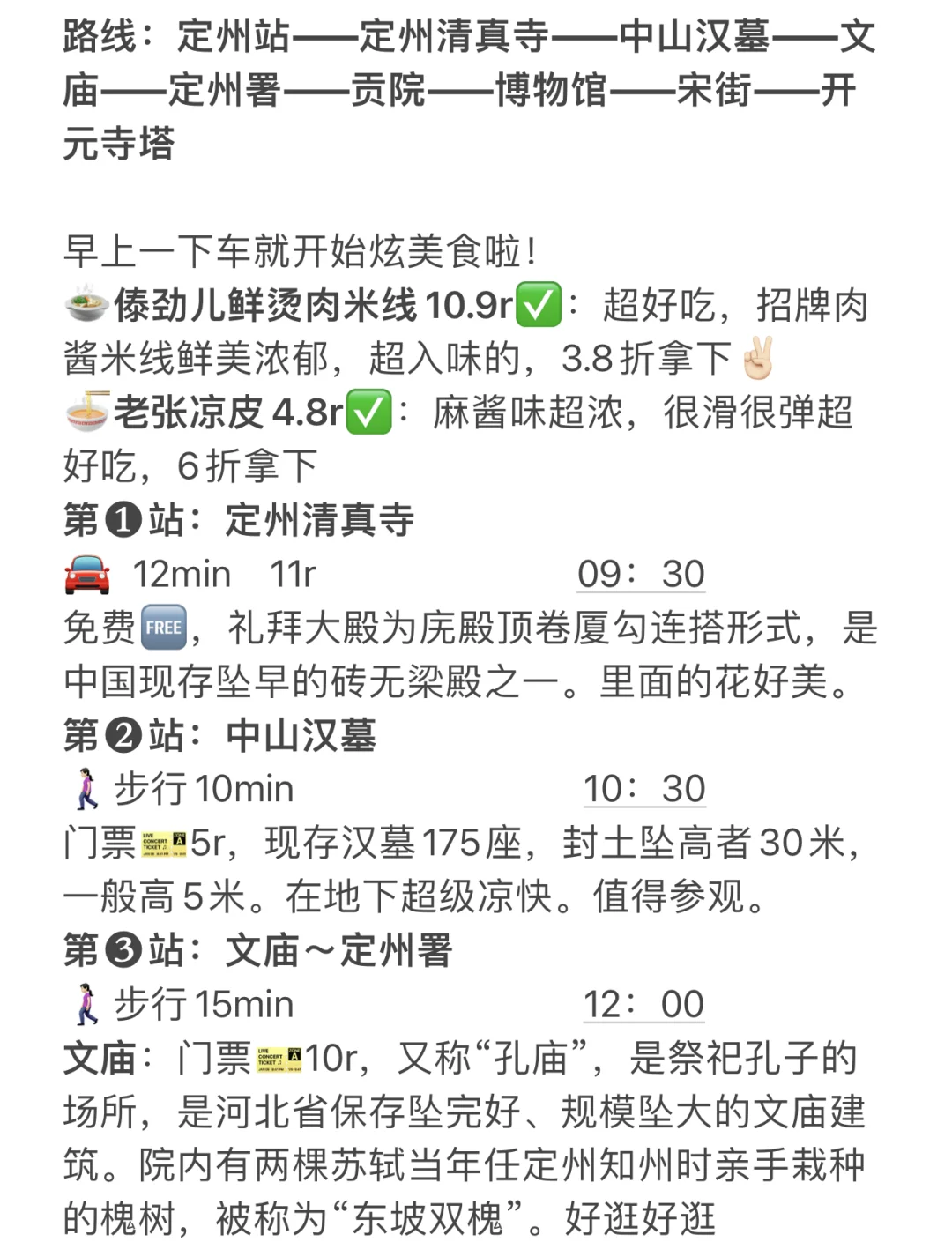 路线:定州站——定州清真寺——中山汉墓——文庙——定州署——贡院——博物馆——宋街——开元寺塔