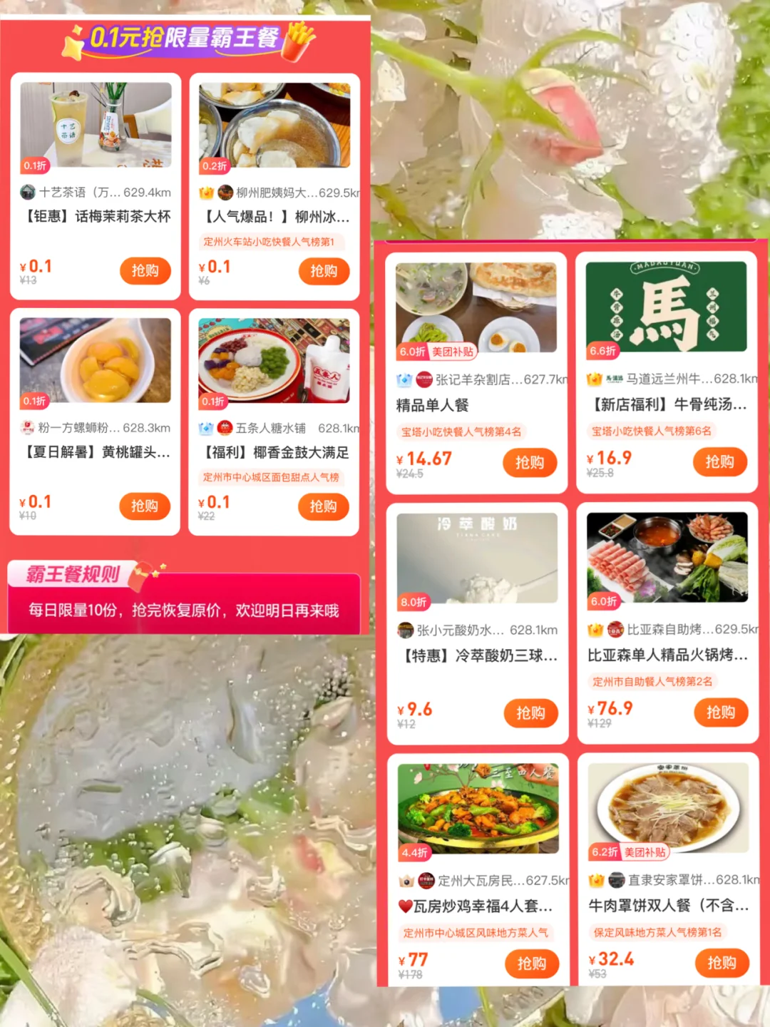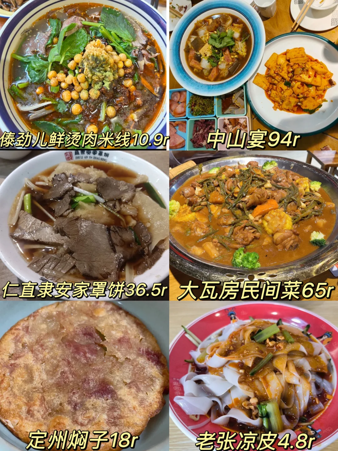 🍲傣劲儿鲜烫肉米线10.9r 🍜老张凉皮4.8r 🍱中山宴94r 🌮仁直隶安家罩饼36.5r 🍱大瓦房民间菜65r 🫔定州焖子18r。。。