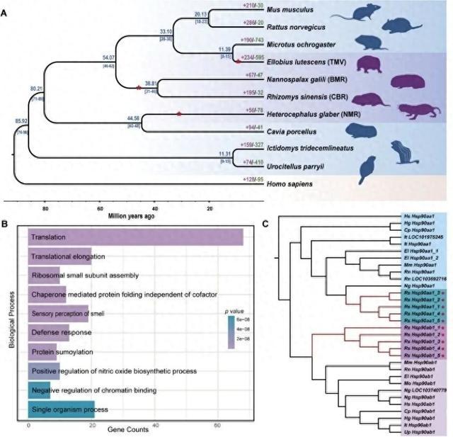 中华竹鼠基因组中Hsp90基因家族的扩张,可能增强了其在低氧和高二氧化碳环境中维持细胞功能的能力,从而有助于适应地下洞穴生活。