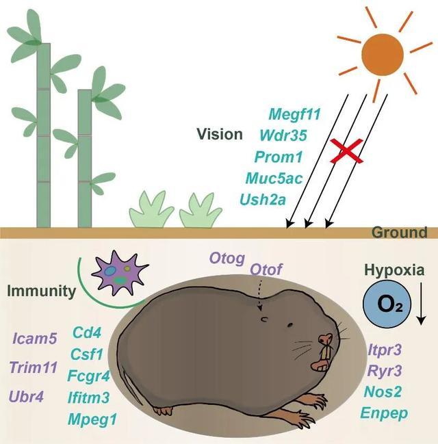 进一步比较基因组学分析发现,在四种地下哺乳动物(中华竹鼠、盲鼹鼠、土黄鼹形田鼠、裸鼹鼠)的基因组中,存在多个与低氧、免疫、听觉和视觉感知相关的趋同适应信号。