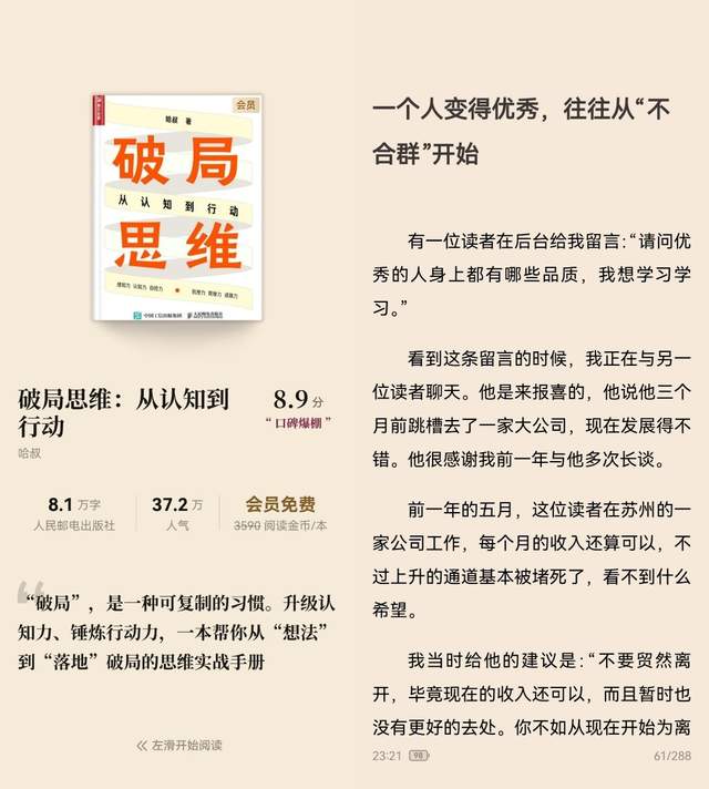我意识到,我缺的不是努力,而是思维的破局。抱着这个想法,我开始在网上找书看。其中,我打开常用的华为阅读,想看看有没有什么经管类的好书,一眼就看到了《破局思维:从认知到行动》。