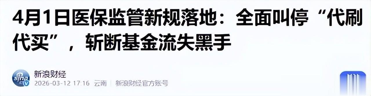参考资料:新浪财经——4月1日医保监管新规落地:全面叫停“代刷代买”,斩断基金流失黑手 2026-03-12