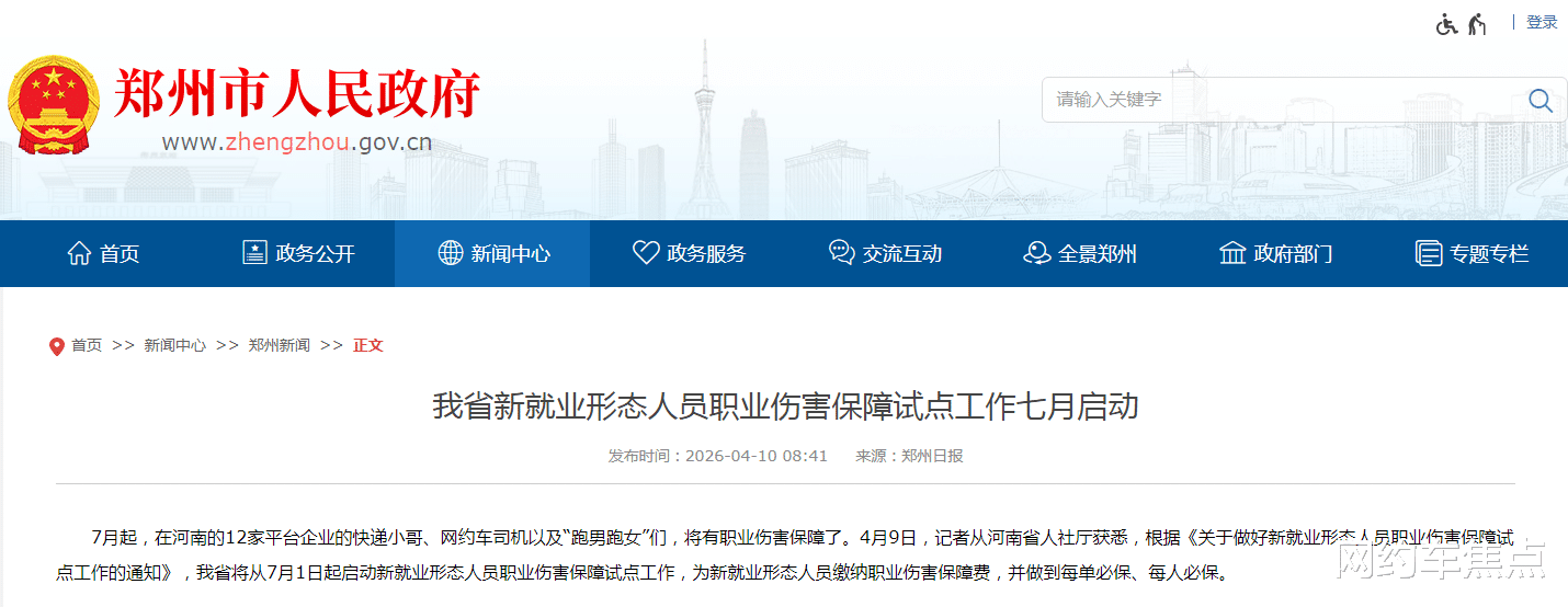 2026年7月1日起,河南将正式启动新就业形态人员职业伤害保障试点工作,网约车司机被纳入保障范围。