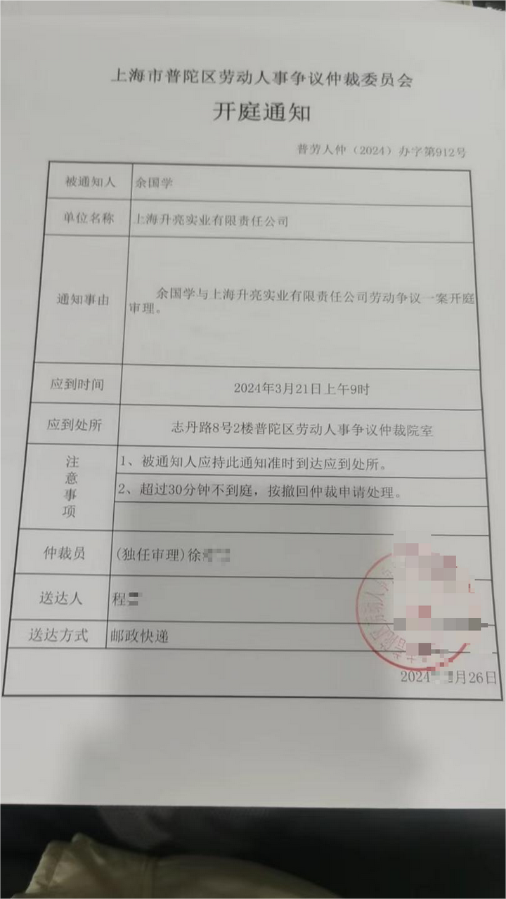 2024 年初,余先生向上海市普陀区劳动人事争议仲裁委员会提交仲裁申请,要求升亮公司支付违法终止用工赔偿金、加班报酬、未签书面协议二倍工资差额等费用,并确认 2014 年 7 月 23 日至 2023 年 3 月 23 日期间存在用工关系。然而,仲裁委员会以证据不足为由,驳回了其全部诉求。