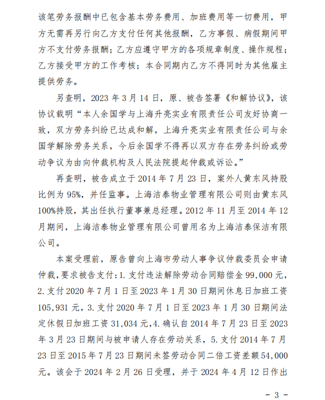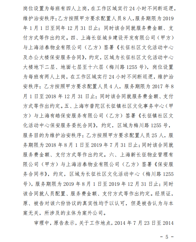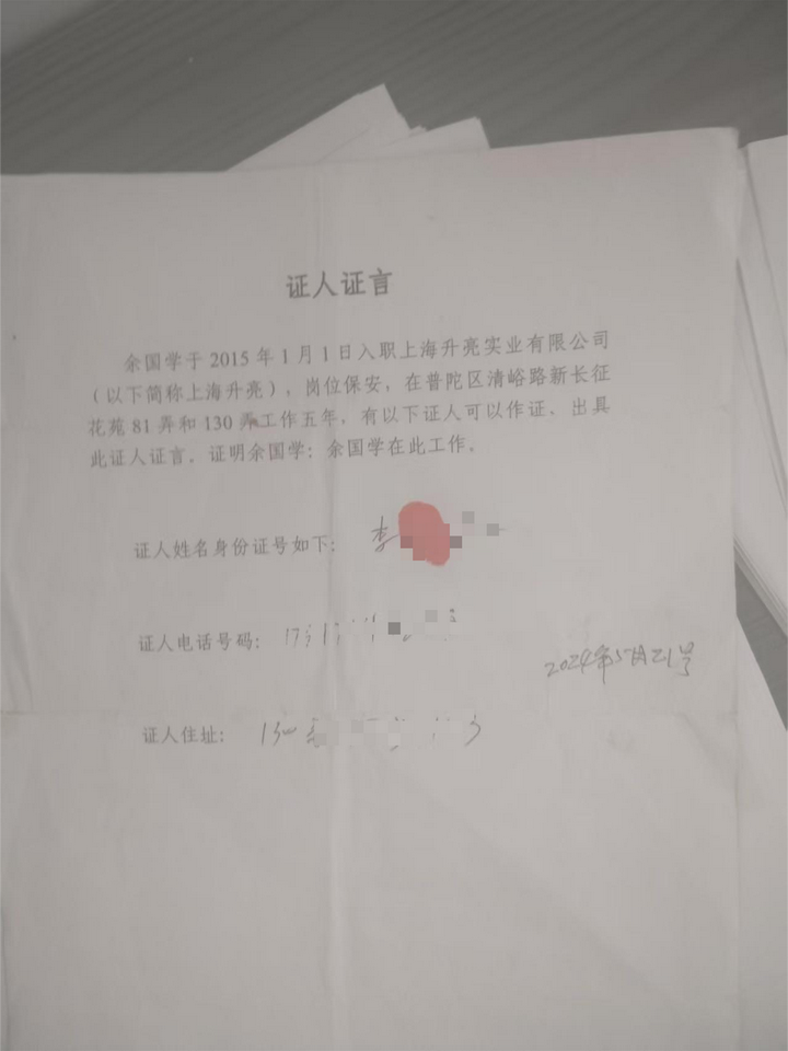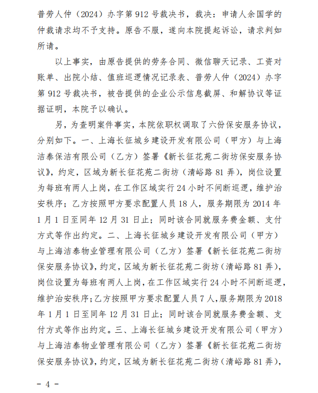 2015 年 1 月,余先生被调至普陀区清峪路 81 弄和 130 弄的新长征花苑继续担任夜班安保,此处物业承包人为刘先生,所用资质归属杰傣物业有限公司,而该公司法定代表人曹某与升亮公司负责人黄某为亲属关系。在接下来的五年里,余先生的工作状态并未改变,依旧是每日 12 小时值守、全年无休,且未签协议、未缴社保、加班无补偿等问题始终存在。期间,余先生多次向公司提出合理诉求,希望完善用工手续、补缴社保并支付加班报酬,但均遭到推诿拒绝。