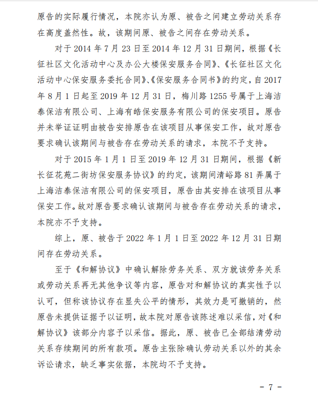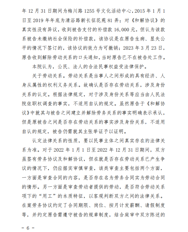 余先生向法院提交了劳务合同、微信聊天记录、工资结算凭证、出院小结、值班巡逻记录、居民证言等多项证据,主张《和解协议》是在其重病缠身、经济困难的情况下签订,并非真实意思表示,应属可撤销。但一审法院经审理后,仅确认 2022 年 1 月 1 日至 2022 年 12 月 31 日期间双方存在劳动关系,驳回了其余全部诉讼请求。
