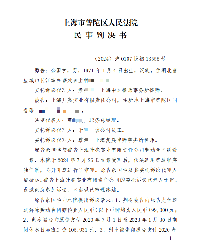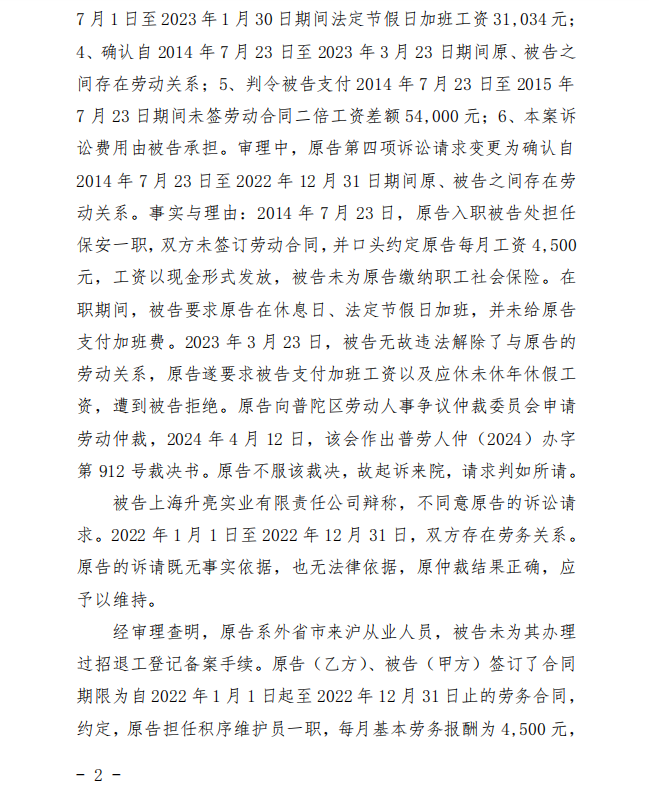 不服仲裁结果的余先生,随即向上海市普陀区人民法院提起诉讼,明确了六项诉讼请求:支付违法终止用工赔偿金 9.9 万元;支付 2020 年 7 月 1 日至 2023 年 1 月 30 日期间休息日加班报酬 10.5931 万元;支付同期法定节假日加班报酬 3.1034 万元;确认 2014 年 7 月 23 日至 2022 年 12 月 31 日期间存在用工关系;支付 2014 年 7 月 23 日至 2015 年 7 月 23 日期间未签书面协议二倍工资差额 5.4 万元;由被告承担诉讼费用。