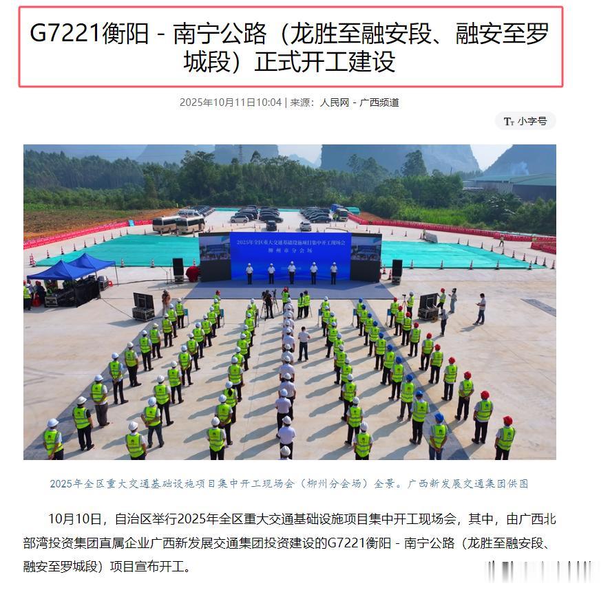 首先,人民网发布了信息,2025年10月10日,自治区举行2025年全区重大交通基础设施项目集中开工现场会,由广西北部湾投资集团直属企业广西新发展交通集团投资建设的G7221衡阳-南宁公路(龙胜至融安段、融安至罗城段)项目宣布开工。