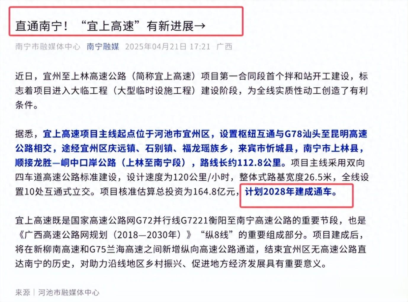 其次,广西交通投资集团有限公司也跟进,官宣了由其投资建设的G7221衡阳—南宁公路(罗城至宜州段)也于2025年10月10日开工建设。