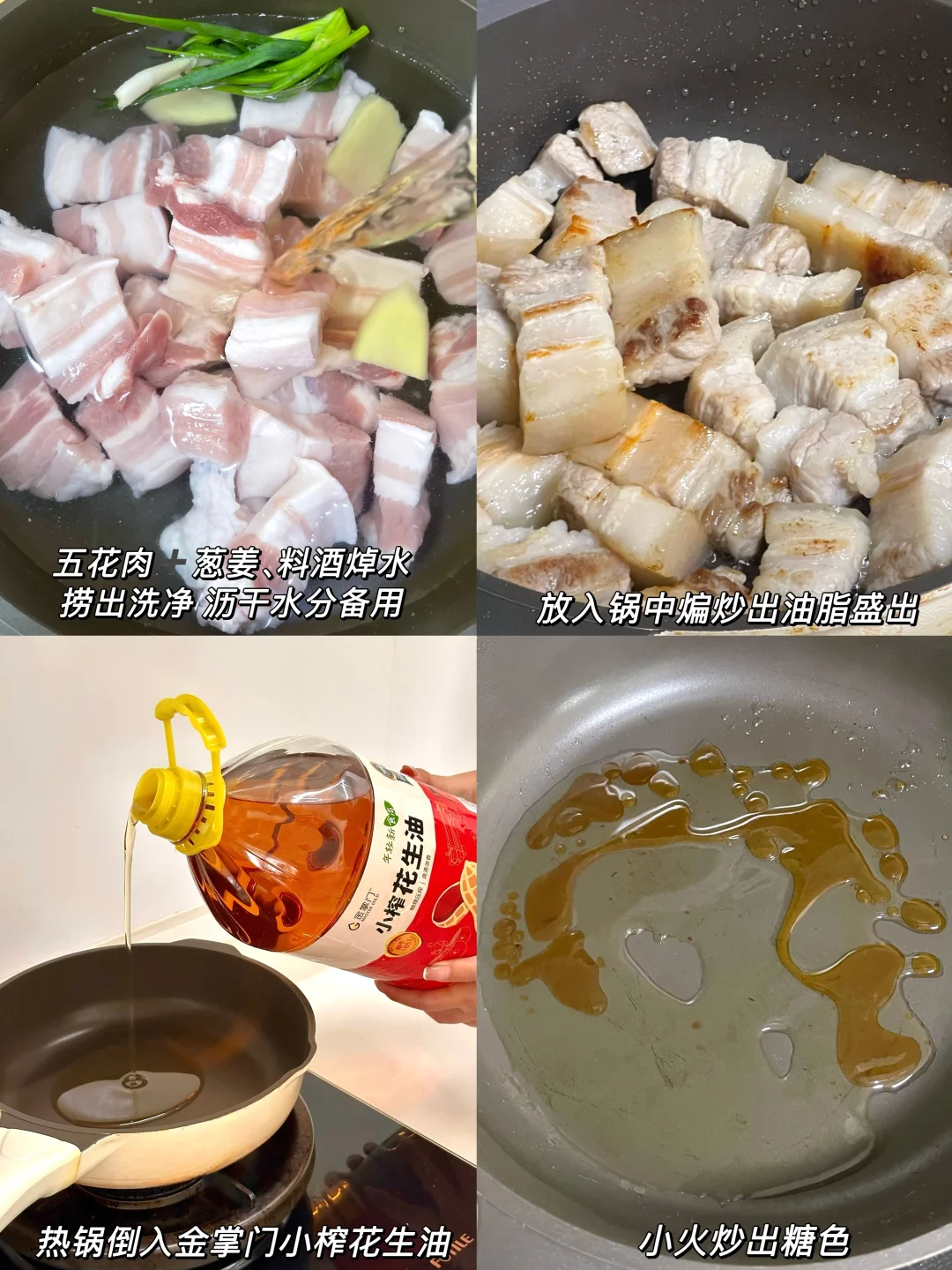 2️⃣热锅倒入金掌门小榨花生油 小火炒出糖色 倒入五花肉翻炒上色