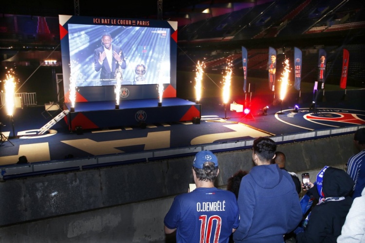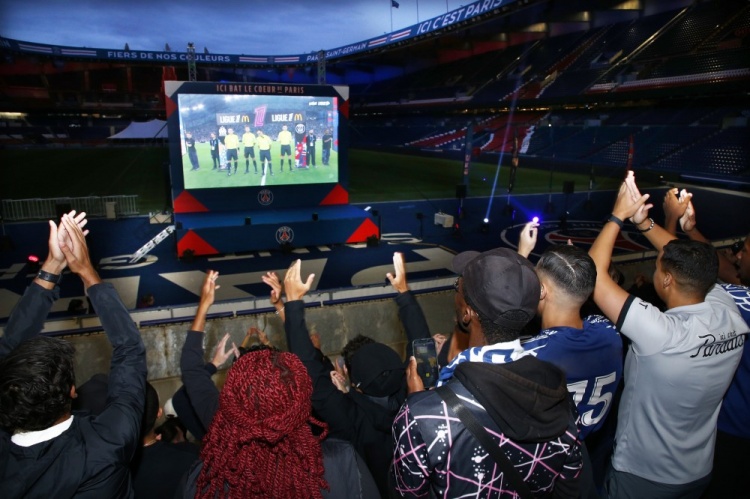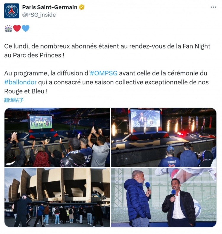 众多巴黎圣日耳曼季票持有者来到王子公园球场,参加球迷之夜活动,观看巴黎圣日耳曼客场对阵马赛的比赛、金球奖颁奖典礼直播。