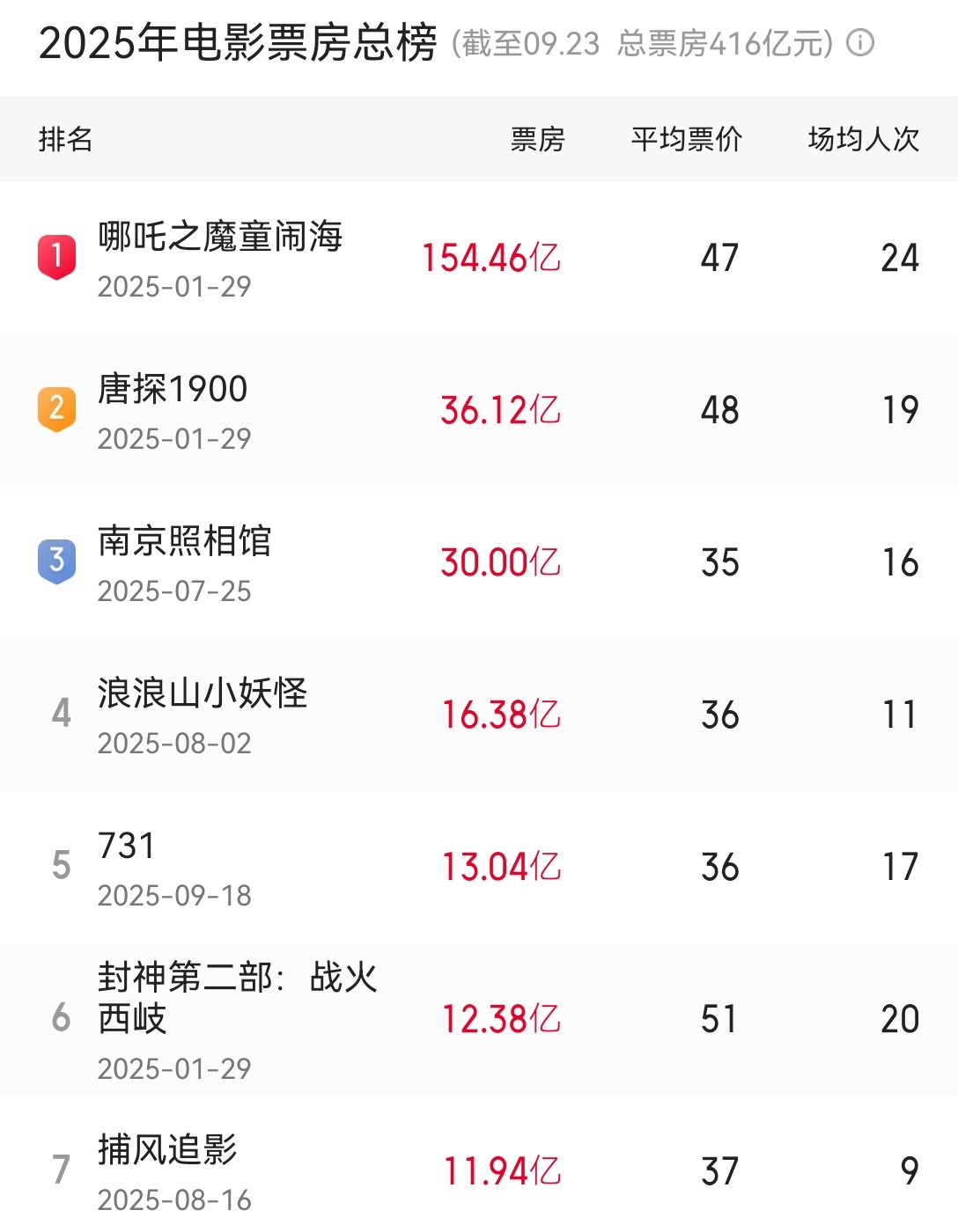 截至目前,2025年全国总票房达到416亿元,在还剩三个多月的前提下,已经逼近2024年全年总票房(约425亿元),目前《南京照相馆》位列2025年中国票房榜第三位,仅次于《哪吒之魔童闹海》和《唐探1900》。今年至今有7部电影票房超10亿元,且都是国产电影。