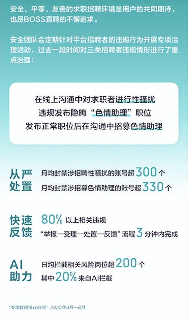 同时,BOSS直聘也在优化举报反馈流程,超过八成的相关举报能在3分钟内完成受理与反馈。