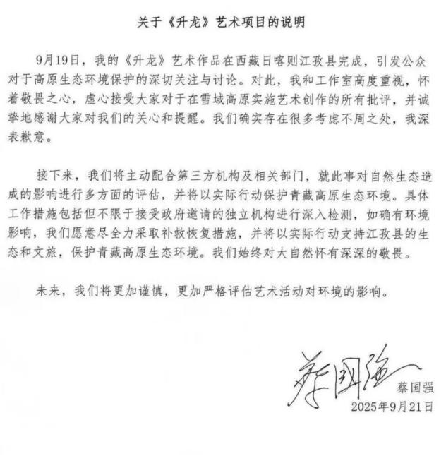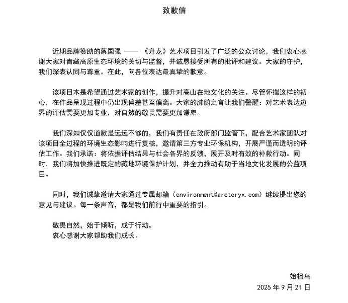 随后,始祖鸟官方和蔡国强本人也纷纷发文致歉,均表示接受批评,配合相关评估工作,并愿意采取相应补救行动。