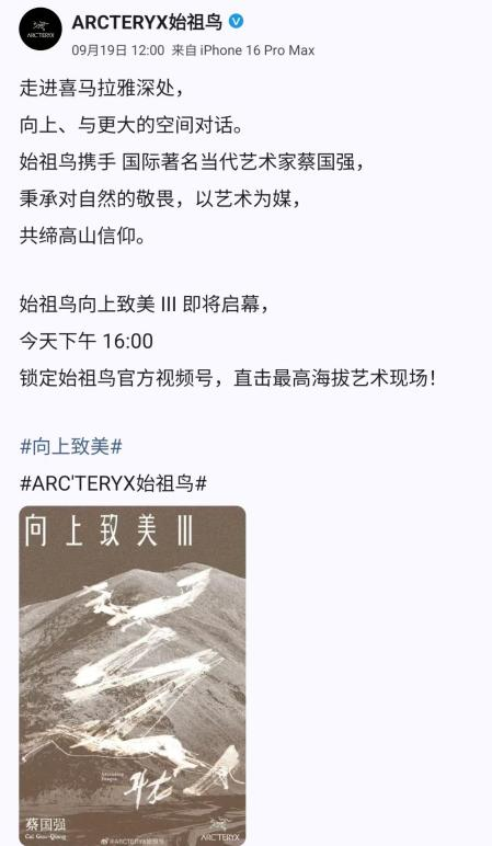 9月19日中午,始祖鸟官方信誓旦旦地宣布了其与艺术家蔡国强在喜马拉雅山脉合作主办的艺术烟花秀活动,声称这是“秉承对自然的敬畏,以艺术为媒,共缔高山信仰”。