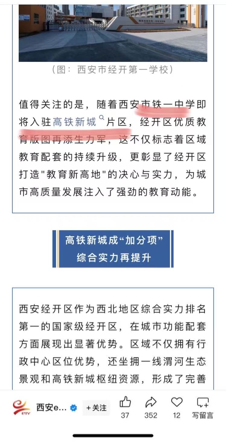 “西安市铁一中学即将入驻高铁新城片区,经开区优质教育版图再添生力军,这不仅标志着区域教育配套的持续升级,更彰显了经开区打造"教育新高地"的决心与实力,为城市高质量发展注入了强劲的教育动能。”