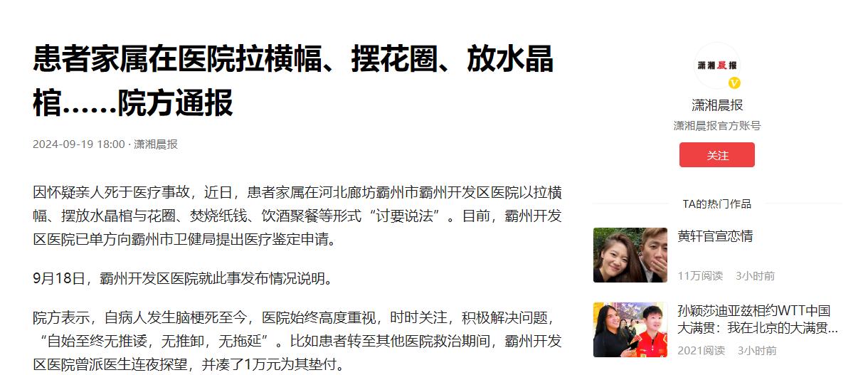 “医疗碰瓷?”河北廊坊,女子子宫切除手术顺利完成后不久,突发急性脑梗死,医院立即把女子转到北京某医院治疗,并组织医生给女子凑了10000元救命钱,女子还是抢救无效死亡。家属认为,这是医疗事故,在医院拉横幅、摆放水晶棺和花圈,甚至还在医院饮酒聚餐,以此来讨要说法。   麻烦看官老爷们右上角点击一下“关注”,既方便您进行讨论和分享,又能给您带来不一样的参与感,感谢您的支持!   2024年9月的一天秋高气爽,但51岁的赵雅却感到无比焦虑。她来到河北廊坊霸州开发区医院,准备接受一个子宫切除手术。赵雅本不是个大惊小怪的人,但"子宫肌瘤"和"癌症"这样的字眼还是让她心惊肉跳。丈夫张胜强握着她的手,柔声安慰着:"别担心,医生说了,现在发现还不算晚,手术很成功,咱俩还要一起去旅游呢!"赵雅终于露出了一丝安心的笑容。   9月5日上午9点,赵雅被推进了手术室。手术进行得很顺利,三个小时后,赵雅平安地回到了病房。看到妻子苍白的脸上荡漾着微笑,张胜强悬着的心总算落了地。他暗暗发誓,从今往后一定要对妻子更好,再也不能粗心大意了。   然而命运却和他开了个大玩笑。术后不到三小时,赵雅突然面无表情口齿不清。医生立即赶来会诊,怀疑是急性脑梗。张胜强感到天旋地转,怎么才过了三个小时,妻子的状态就发生了如此急转直下的变化?他简直不敢相信自己的眼睛。   医院领导高度重视,立即启动应急预案。一边安排120救护车,将赵雅火速转往北京宣武医院,一边向卫健局如实报告了这一情况。赵雅辗转来到了北京右安门医院住进了重症监护室,而丈夫张胜强却在走廊里无助地踱着步。他不明白妻子明明那么健康,怎么会说变就变?   9月8日张胜强颤抖地给医院打来电话,哽咽着说妻子病情加重,但医疗费已经花光了。霸州开发区医院的医生闻讯连夜赶赴北京,为赵雅送去了1万元的爱心捐款,希望能帮助他们渡过难关。这一幕让在场的人无不动容,张胜强更是泪如雨下。   但命运的嬉弄还没有结束。9月14日赵雅永远地闭上了眼睛,再也没有醒来。张胜强瞬间崩溁,他质问上天为何如此残忍,要将他的爱人夺走。悲伤很快就被愤怒所取代,他将怒火对准了医院。在他看来如果不是那个手术,妻子又怎会离他而去?主刀医生难辞其咎!张胜强很快就将一纸诉状,狠狠地甩在了霸州开发区医院的办公桌上......   霸州开发区医院的院长李明是一位德高望重的医者。当他听说张胜强要起诉医院时,他既惊讶又悲伤。他明白丧妻之痛是多么撕心裂肺,但他更清楚自己的医院和医生们问心无愧。从赵雅入院的那一刻起,医院就竭尽全力地救治,几乎倾尽了所有的资源。但人力终有穷时,再高明的医生也无法掌控生命的全部奥秘。   李院长决定亲自接见张胜强,向他讲述事情的原委。他坦诚地说脑梗和手术并无直接关联,而是由赵雅的基础疾病和年龄等因素综合导致的。医院已经尽了最大的努力,甚至不惜自掏腰包捐款。如果这也算是过错,那就是"医德"犯下的错。   张胜强一时语塞,但内心的怒火依然难以平息。他执意要在医院拉起横幅,摆上花圈和妻子的遗像,用行动来昭示自己的立场。面对这一幕,医护人员百感交集。他们固然理解张胜强的痛苦,但也对自己的专业操守感到骄傲和自豪。一时间,医院院内剑拔弩张,争执不休。   眼看事态难以控制,李院长当机立断,一方面向卫健局提出医疗纠纷鉴定申请,一方面报警请求公安机关协助维持秩序。警察来到现场后反复劝说张胜强,要他遵纪守法,通过正当途径表达诉求。但张胜强却变本加厉,竟在医院大厅焚烧起纸钱,还摆起了酒席,场面一度失控。   正当众人一筹莫展时,院长李明再次来到张胜强面前。他没有苛责,而是给了这个可怜的男人一个大大的拥抱。"赵雅的事,医院愿意经受法律的审判。但在那之前,你要相信医生,也要相信法律。你现在需要的不是掀翻过去,而是面对未来啊!"   泪水瞬间模糊了张胜强的眼睛。他想起了妻子的音容笑貌,想起了医生捐款时的真诚目光,也想起了警察苦口婆心的劝导。他终于明白,再多的怨恨也无法挽回已逝的生命,只有化悲痛为力量,才能重新拥抱新的人生。   张胜强缓缓地卸下了横幅吹灭了蜡烛散去了人群。当最后一缕夕阳洒进医院的窗子,他和李院长紧紧地握住了手。这一握不只是和解,更是一个崭新开始的信号。生命无常,但正义和爱永恒闪光。张胜强知道他要用余生去捍卫它们,去延续妻子未竟的心愿,去开创一个更加包容和谐的明天。   几个月后医疗纠纷的尘埃落定。经过鉴定医院并无过错,但院方仍然决定向张胜强提供适当的抚恤,以表达歉意。张胜强也公开向医护人员道歉,感谢他们曾经为妻子所做的一切。   (文中人物均为化名)   信息来源:潇湘晨报——2024.09.19——《患者家属在医院拉横幅、摆花圈、放水晶棺......院方通报》