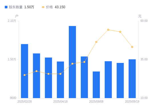 日期A股户数(户)流通A股户均持股数(股)户均持股市值(万元)2025-08-20147398137.0344.182025-08-08131319133.4842.372025-06-30154747750.5325.902025-05-20202165932.5119.162025-04-18146878165.8420.982025-04-10153147831.5120.132025-03-31159457521.5920.662025-02-28174016890.0217.182025-01-27184716490.8916.092024-12-31193696189.9615.25