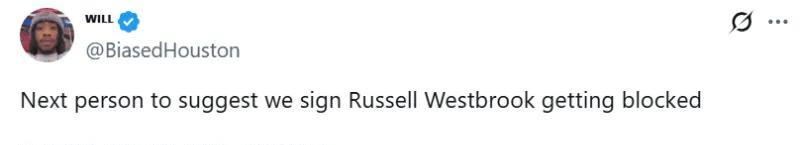 火箭博主:谁再提议我们签下拉塞尔-威斯布鲁克,直接拉黑! 火箭后卫弗雷德-范弗利特遭遇了前交叉韧带(ACL)撕裂,可能赛季报销。 随后,多家美媒呼吁火箭用老将底薪签下自由球员拉塞尔-威斯布鲁克。 对此,火箭博主BiasedHouston更推,呼吁媒体别乱带节奏,并写道: “谁要是再提议我们签下拉塞尔-威斯布鲁克,直接拉黑!” 目前,火箭总薪资距第一土豪线仅120万美元,已无法签下任何的标准合同,只能通过交易来腾出薪资空间。 24-25赛季常规赛,威斯布鲁克为掘金出战75场比赛,场均得到13.3分4.9篮板6.1助攻,投篮命中率44.9%。