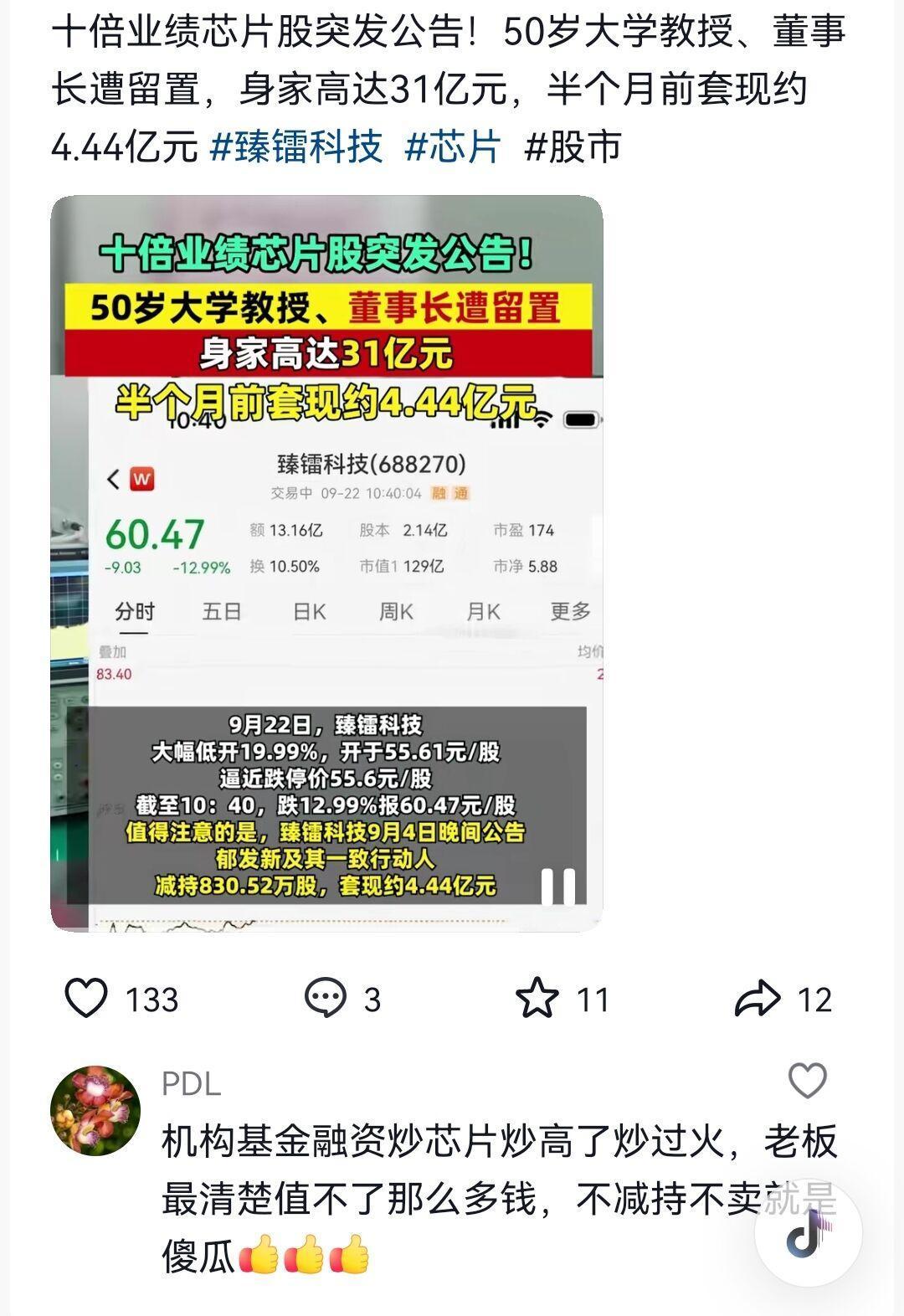 浙大教授被留置, 被坑最惨的有哪些? 为什么半月前套现股票? 股市刚收盘,科创板的臻雷科技大跌12.56%,后续走势不容乐观。作为公司董事长,因个人问题影响公司股市暴跌,半个月前套现约4.44亿元,持股股股民也被殃及。 有网友说芯片题材被炒高炒过火,所以董事长一致行动人减持套现,您觉得对吗?