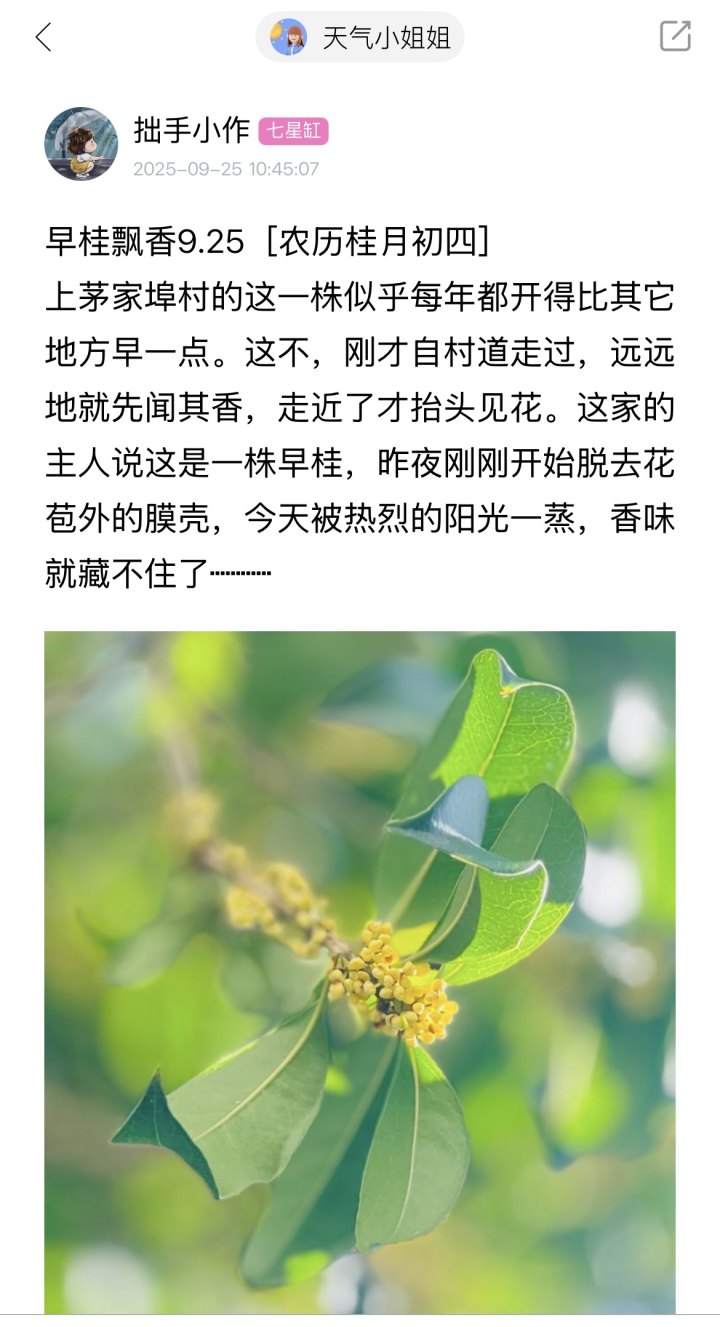 虽说最近的天气并不是桂花喜欢的冷凉天气,但全城几百万棵桂花树里,总有这么几个显眼包。橙友“拙手小作”说,上茅家埠村有一株桂花似乎每年都开得比其他地方早一点,“刚才自村道走过,远远地就先闻其香,走近了才抬头见花。这家的主人说这是一株早桂,昨夜刚刚开始脱去花苞外的膜壳,今天被热烈的阳光一蒸,香味就藏不住了……”
