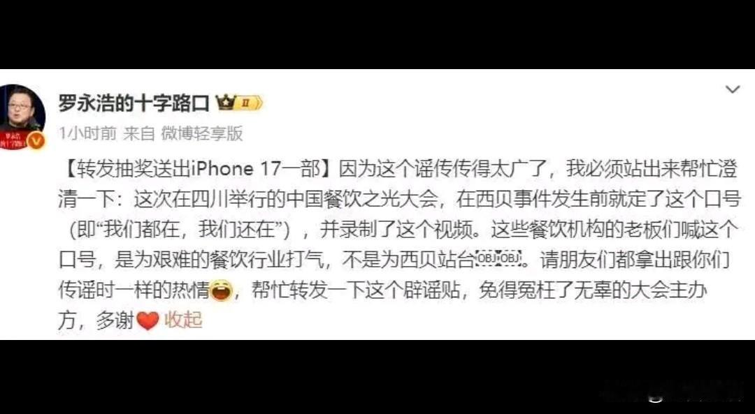 罗永浩于9月21日发布一条澄清新闻,呼吁朋友们帮忙转发,并拿出与传谣时一样的热情! 他说:“我们在,我们都在”这句口号是在西贝事件发生前就定了的,并录制了这个视频。 这些餐饮机构的老板们喊这个口号,是为艰难的餐饮行业打气,不是为西贝站台。 之前我也信了这传谣,因为太真实了,口号是真的,人物是真实的,但是时间不对,打了个时间差! 做错了就承认,第一时间改过来并澄清! 所以,我站出来参与澄清并呼吁转发,尽自己微弱的力量喊一声:我们错怪那些餐饮企业了,一起转发一下吧!