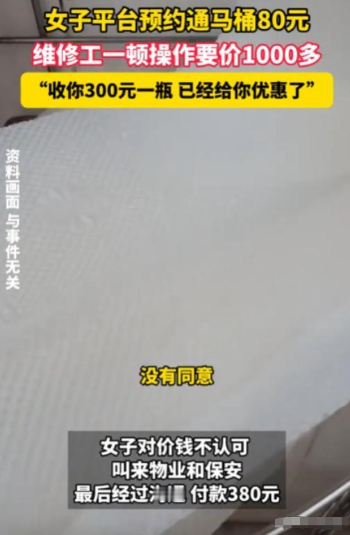 “抢钱呢?”广东,女子花 80找人通马桶,最后被告知需要支付1000多!师傅:你这马桶太难通了,一瓶强酸 380,我倒了三瓶,算你1000 多,已经给你优惠!”女子:你这是坑人,我没有这么多钱!也没同意你倒!双方僵持不下,女子叫来物业和保安帮忙解决,最终结果如何?   麻烦看官老爷们右上角点击一下“关注”,既方便您进行讨论和分享,又能给您带来不一样的参与感,感谢您的支持!   小陈(化名)最近遇到了一件郁闷的事。前几天家里的马桶突然堵住了,怎么捅都不通。小陈在网上搜索,发现一个疏通服务,标价只要80元。小陈一看心想这价格挺公道,就预约了上门服务。   师傅来了后,拿出工具试了试,摇摇头说:"这马桶堵得很严重啊,简单疏通肯定不行。得用强酸来溶解里面的污垢。"   小陈有点犹豫,问:"强酸?是不是很贵啊?"   师傅说:"这强酸是我们专门配制的,疏通效果杠杠的。一瓶380元,保证给你通了。"   小陈想一瓶就能搞定,那还行吧。就答应让师傅使用强酸。师傅先倒了一瓶进去,捅了半天,说还是不行。又拿出一瓶,再倒进去。就这样,师傅一边捅,一边说堵得太严重,一瓶瓶地往里倒。   等到马桶终于疏通了,小陈松了口气问师傅费用多少。师傅掰着指头算:"我一共用了三瓶强酸,每瓶380元,算你便宜点,每瓶300元,一共900元。再加上上门费80元,总共980元。"   小陈惊呆了:"不是说80元包通吗?怎么现在要1000块近?强酸的事情你也没提前跟我说清楚啊。"   师傅有点不耐烦:"我们这一瓶强酸,市面上都是几百块,已经很便宜了。再说了,刚开始用一瓶的时候,你也没提出异议啊。"   小陈觉得自己被狠狠地坑了一笔,但又拿不出什么证据。师傅看小陈不愿意付钱,态度变得强硬起来,说什么"你耽误我大半天""是不是不讲信用"之类的话。小陈一个头两个大,只好先付了钱把人打发走。   事后小陈在网上发帖诉苦,很多网友说自己也遇到过类似情况,纷纷支招。有人说那所谓的"强酸",其实就是普通的通厕灵,在五金店才15块一瓶。还有老师傅说,一般疏通马桶根本用不到什么强酸,单纯就是骗钱的套路。   看着网友们的评论,小陈恍然大悟,原来自己上当了。师傅利用业务知识的信息不对称,用"强酸"的幌子,欺骗自己接受了高价服务。更让人气愤的是,师傅说用一瓶的时候自己没提出异议,就当做默许了后面的额外收费。   小陈算是长了个教训。疏通下水道这种上门服务,消费者确实很容易吃亏。不过,网友们也给了很多防坑指南:比如货比三家,不要图便宜贪小便宜;开工前先明确收费标准,杜绝模糊服务;尽量避免当场付全款,要留下证据以防纠纷。   希望小陈的遭遇能给大家提个醒。当一个行业良莠不齐的时候,消费者要学会自我保护,同时相关部门也要持续整顿规范,共同营造一个公平诚信的消费环境。毕竟,一个透明阳光的服务市场,对大家都好。   小陈的遭遇在网上引起了热烈的讨论。很多网友也分享了自己的类似经历。大家一致认为,疏通服务行业的乱象,亟待整治。   有位老师傅就指出,疏通马桶其实是有行业规范的。正规操作是先用皮搋子等工具疏通,如果不行再考虑使用疏通剂。而且疏通剂的用量和价格,也应该事先告知消费者。像小陈遇到的那种情况,明显就是故意模糊概念,诱导消费。   还有网友从法律角度分析,小陈被坑的过程中,涉嫌多项违法行为。首先师傅虚构了"强酸"的概念,夸大其作用和价值,涉嫌价格欺诈,违反了《价格法》。其次师傅在未经小陈明确同意的情况下,擅自使用了更多疏通剂,侵犯了消费者的知情权和选择权,违反了《消费者权益保护法》。   如果事发时能收集到证据,小陈完全可以向市场监管部门投诉,要求维权。即便是事后,小陈也可以起诉到法院,讨回公道。网友们建议,遇到纠纷时,要学会运用法律武器保护自己。   当然光靠消费者自己提高警惕是不够的。疏通服务市场之所以问题频出,根源还在于监管的缺位。一些不良商家逐利心切,在暴利的诱惑下铤而走险,消费者的权益就成了他们眼中的"唐僧肉"。   对此有网友呼吁相关部门要出重拳,加大日常抽查和巡查力度,严厉打击各类违法行为。同时,也要建立健全行业规范,从业人员培训,信用评价等长效机制,引导行业自律,提升服务质量。   事实上类似的消费纠纷在家政、维修等多个领域都普遍存在。这背后反映出的,是社会诚信体系的缺失,也是行业规范建设的滞后。消费者维权难,不仅伤害了消费者的利益,也扰乱了市场秩序,阻碍了行业的健康发展。   作为消费者,我们在提高自我保护意识的同时,也要勇于举报投诉,履行监督义务。而作为监管部门,在强化事中事后管理的同时,也要加强事前引导,从机制和法规层面入手,堵塞制度漏洞。只有双管齐下,标本兼治,才能营造一个诚信经营、放心消费的市场环境。   信息来源:南昌晚报
