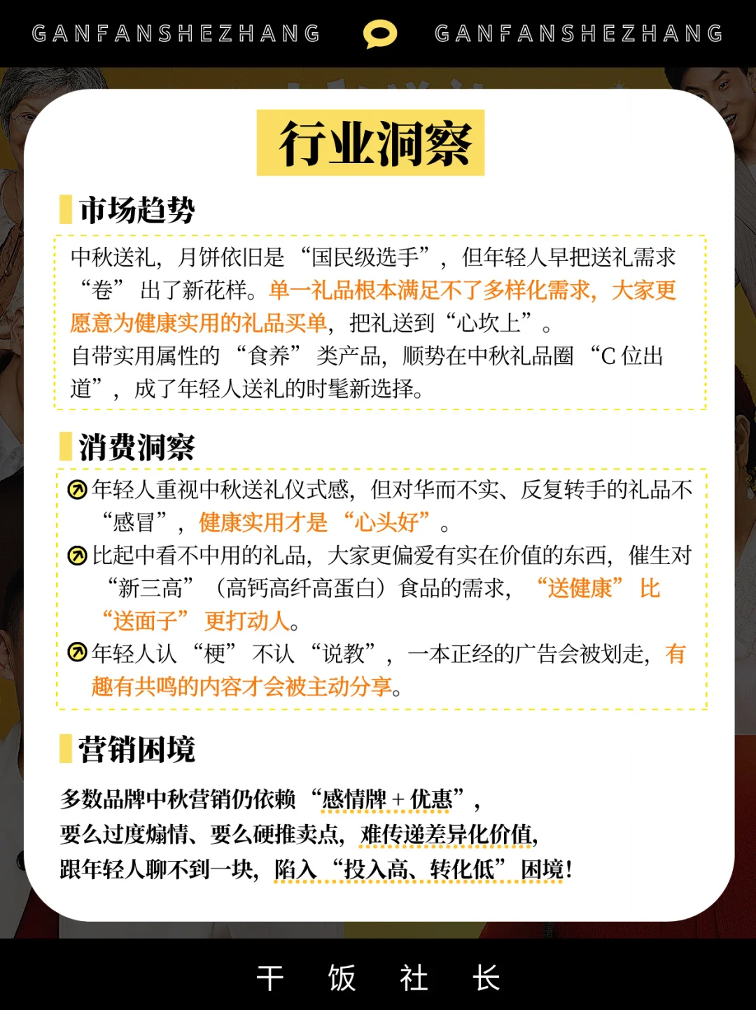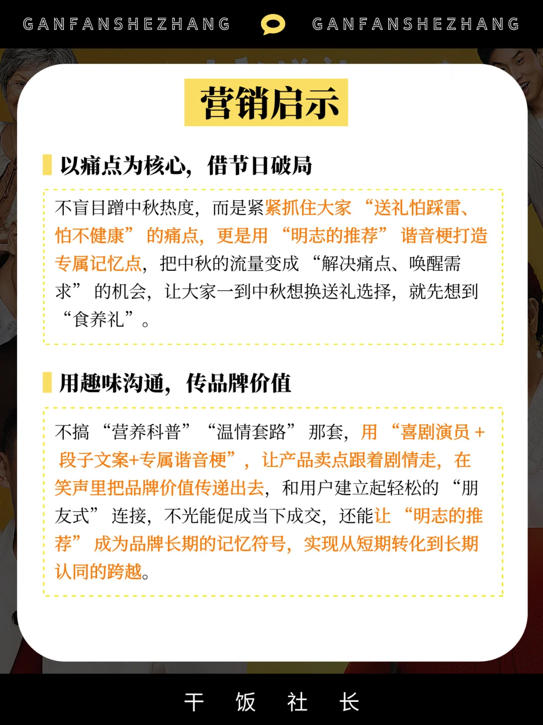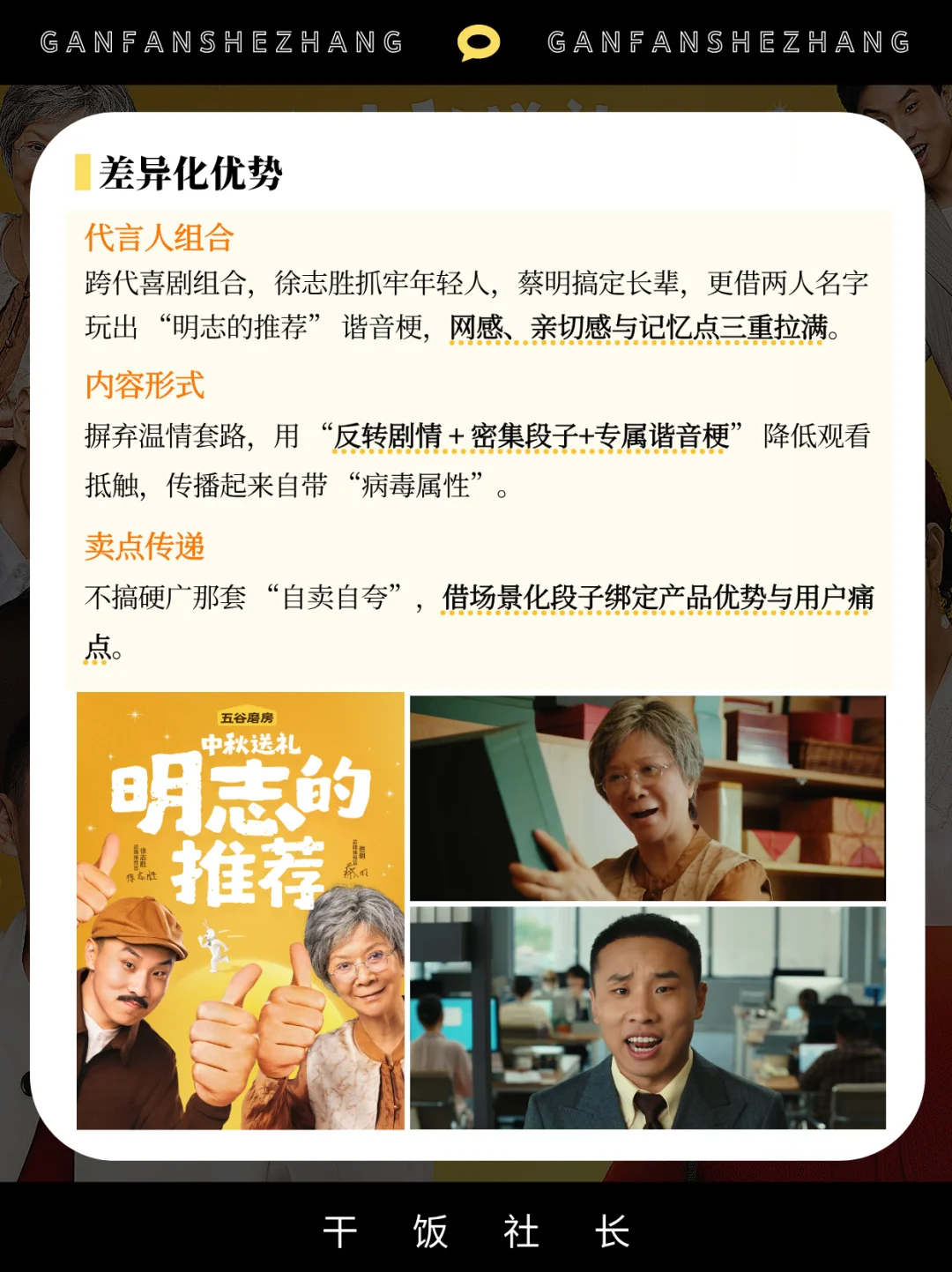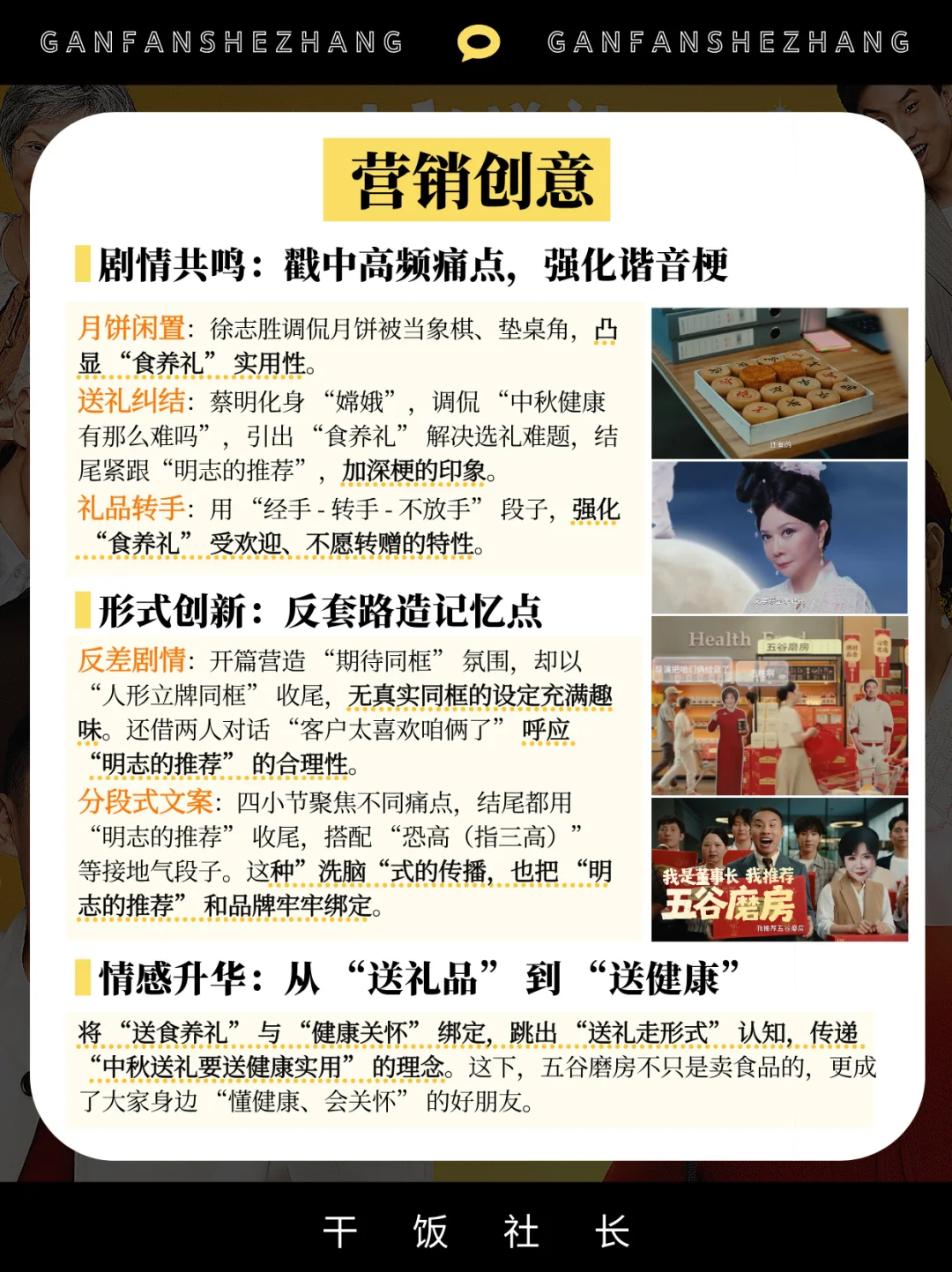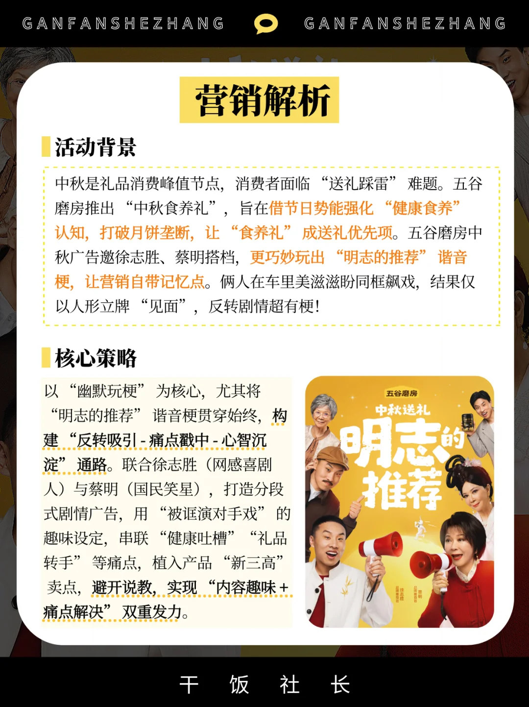 在中秋礼品同质化严重的市场环境下,品牌想要突破“月饼=中秋礼”的固有认知,关键在于找到既贴合节日氛围又能戳中用户痛点的创新沟通方式。 五谷磨房借势中秋节点,跳出传统礼品营销的“硬广”和“煽情”套路,通过极具网感的内容创意与精准的代言人组合,成功将“食养礼”打造为中秋健康送礼新选择,不仅实现了品牌心智的高效渗透,更打破了中秋礼品市场的单一格局。 本期具体拆解👉 五谷磨房是如何通过中秋节点实现“礼品品类破圈”❓ 如何通过“幽默段子+痛点共鸣”这一软沟通实现用户心智占领❓